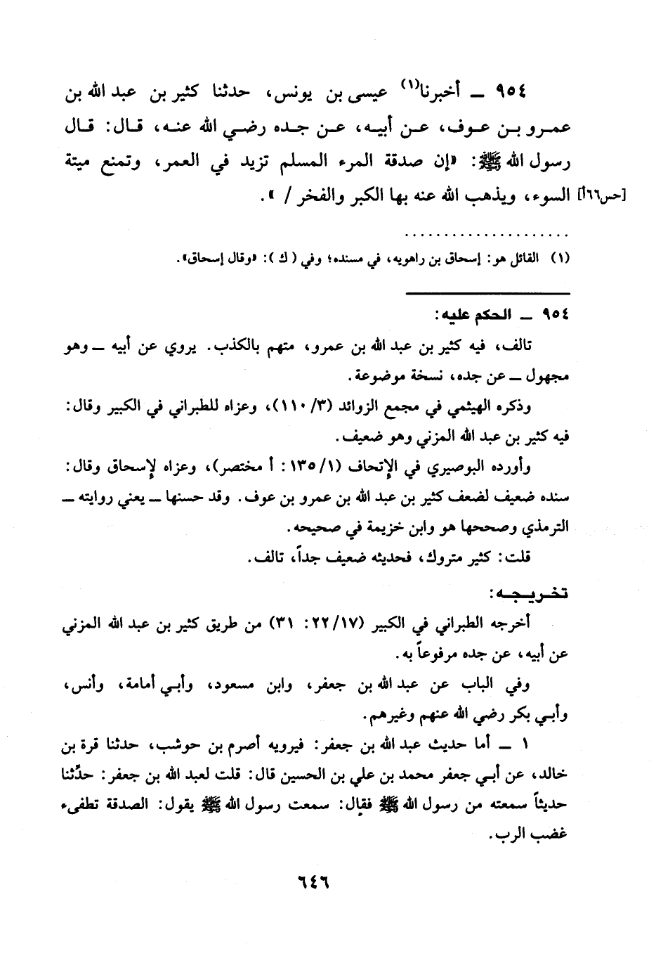 954 - أَخْبَرَنَا عِيسَى بْنُ يُونُسَ حدثنا كَثِيرُ بْنُ عَبْدِ اللَّهِ بْنِ عَمْرِو بْنِ عَوْفٍ عَنْ أَبِيهِ عن جده رَضِيَ الله عَنْه قَالَ قَالَ رَسُولُ اللَّهِ صَلَّى اللَّهُ عَلَيْهِ وَسَلَّمَ إِنَّ §صَدَقَةَ الْمَرْءِ الْمُسْلِمِ تَزِيدُ فِي الْعُمُرِ وَتَمْنَعُ مِيتَةِ السَّوْءِ وَيُذْهِبُ الله عنه بِهَا الْكِبْرَ وَالْفَخْرَ