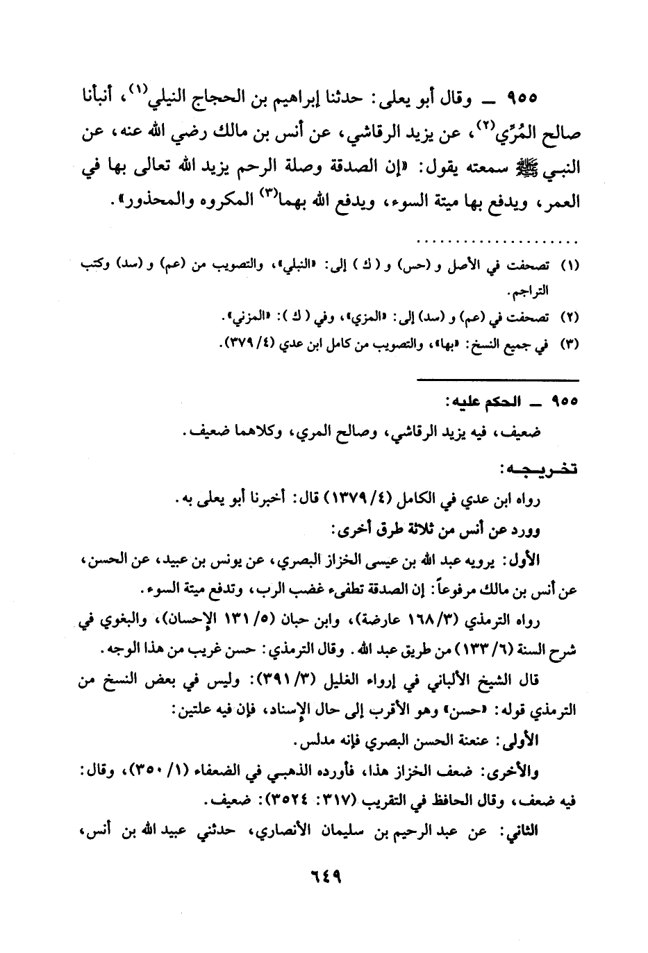 حَدَّثَنَا إِبْرَاهِيمُ بْنُ الحاد النيلي أنبأنا صَالِحٌ الْمُرِّيُّ عَنْ يَزِيدَ الرَّقَاشِيِّ عَنْ أَنَسِ بن مالك رَضِيَ الله عَنْه عَنِ النَّبِيِّ صَلَّى اللَّهُ عَلَيْهِ وَسَلَّمَ سمعته يَقُولُ إِنَّ §الصَّدَقَةَ وَصِلَةَ الرَّحِمِ يزيد الله تعالى بِهَا فِي الْعُمُرِ وَيَدْفَعُ باه مِيتَةَ السَّوْءِ ويدفع الله بهما المكروه وَالْمَحْذُورَ