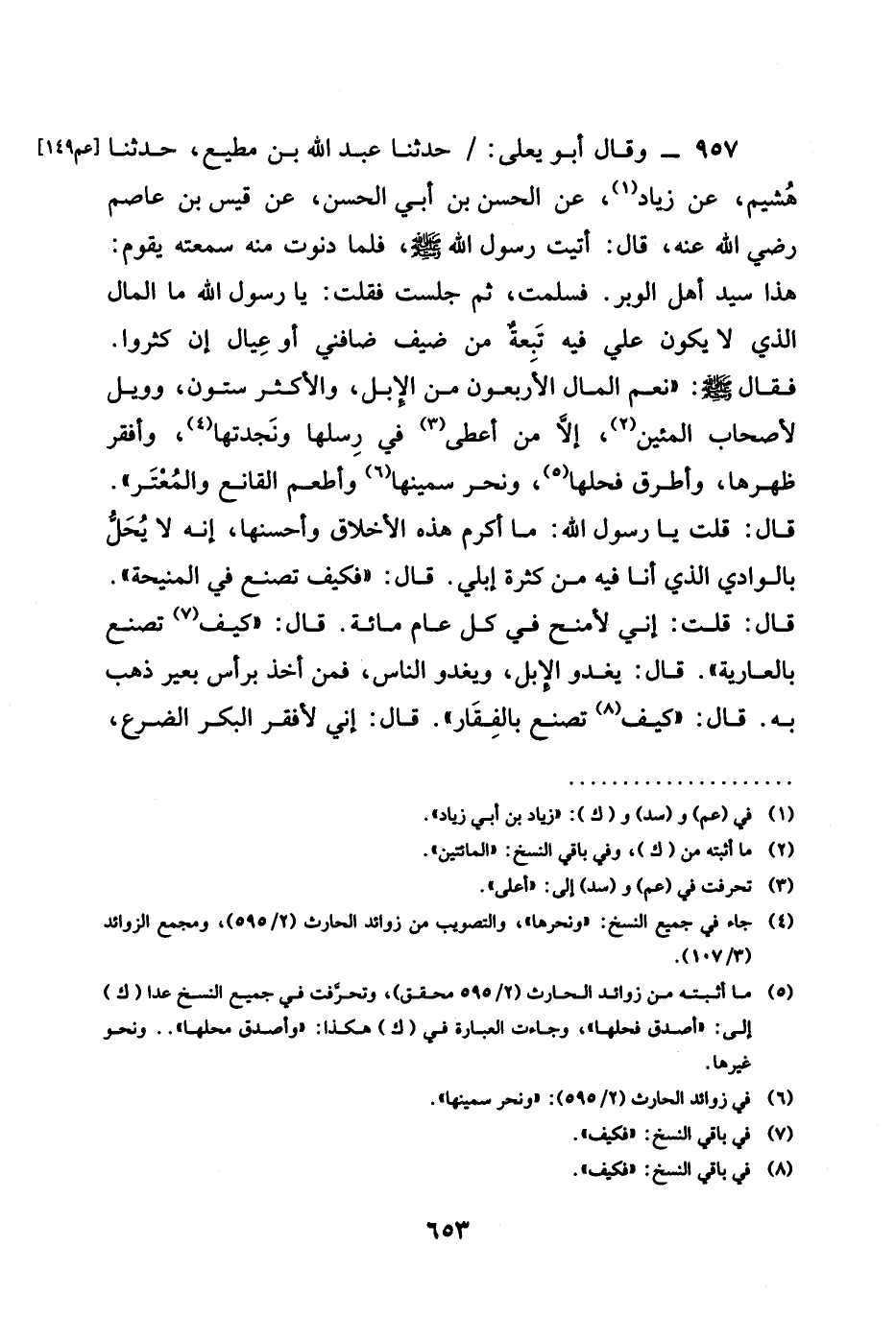 حَدَّثَنَا عَبْدُ اللَّهِ بْنُ مُطِيعٍ حدثنا هُشَيْمٌ عَنْ زِيَادِ عَنِ الْحَسَنِ بْنِ أَبِي الْحَسَنِ عَنْ قَيْسِ بن عاصم رَضِيَ الله عَنْه قَالَ أَتَيْتُ رَسُولَ اللَّهِ صَلَّى اللَّهُ عَلَيْهِ وَسَلَّمَ فَلَمَّا دَنَوْتُ منه سمعته يقوم هَذَا سَيِّدُ أَهْلِ الْوَبَرِ فَسَلَّمْتُ ثُمَّ جَلَسْتُ فَقُلْتُ يَا رَسُولَ اللَّهِ مَا الْمَالُ الَّذِي لَا يَكُونُ عَلَيَّ فِيهِ تَبِعَةٌ مِنْ ضَيْفٍ ضَافَنِي أَوْ عِيَالٍ إِنْ كَثُرُوا فَقَالَ صَلَّى اللَّهُ عَلَيْهِ وَسَلَّمَ §نِعْمَ الْمَالُ الْأَرْبَعُونَ مِنَ الْإِبِلِ وَالْأَكْثَرُ سِتُّونَ وَوَيْلٌ لِأَصْحَابِ المئين إِلَّا مَنْ أَعْطَى في رسلها ونجدتها وَأَفْقَرَ ظهرها وأطرق فحلها ونحر سمينها وَأَطْعَمَ القانع والمعتر فال قُلْتُ يَا رَسُولَ اللَّهِ مَا أَكْرَمَ هَذِهِ الْأَخْلَاقَ وَأَحْسَنَهَا إِنَّهُ لَا يَحِلُّ بِالْوَادِي الَّذِي أَنَا فِيهِ مِنْ كَثْرَةَ إِبِلِي قَالَ فَكَيْفَ تَصْنَعُ فِي الْمَنِيحَةِ قَالَ قُلْتُ إِنِّي لَأَمْنَحُ فِي كُلِّ عَامٍ مائة قال كيف تَصْنَعُ بالعارية قال يغدو الْإِبِلَ ويغدو النَّاسَ فَمَنْ أَخَذَ بِرَأْسِ بَعِيرٍ ذَهَبَ بِهِ قَالَ كَيْفَ تَصْنَعُ بِالْفِقَارِ قال إني لأفقر الْبِكْرَ الضَّرْعَ