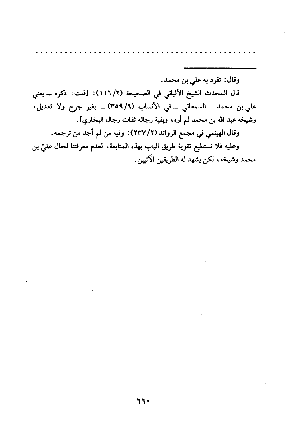 قال المحدث الشيخ الألباني في الصحيحة (2/ 116): [قلت: ذكره -يعني علي بن محمَّد- السمعاني -في الإنساب (6/ 359) - بغير جرح ولا تعديل، وشيخه عبد الله بن محمَّد لم أره، وبقية رجاله ثقات رجال البخاري".
