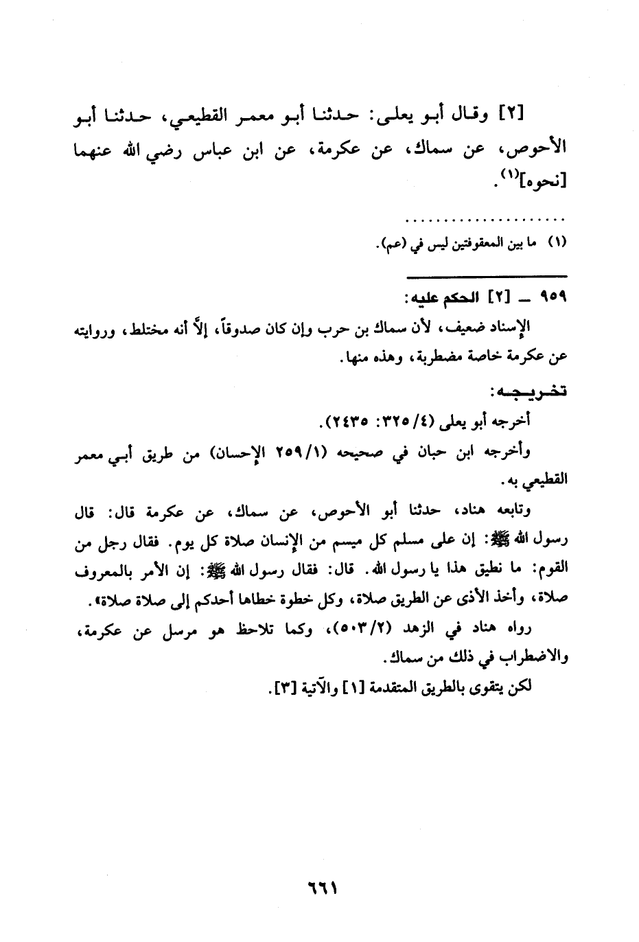 [2] وَقَالَ أَبُو يَعْلَى: حَدَّثَنَا أَبُو مَعْمَرٍ الْقَطِيعِيُّ، حدثنا أَبُو الْأَحْوَصِ، عَنْ سِمَاكٍ، عَنْ عِكْرِمَةَ، عَنِ ابْنِ عَبَّاسٍ رضي الله عنهما [نحوه] (¬1).