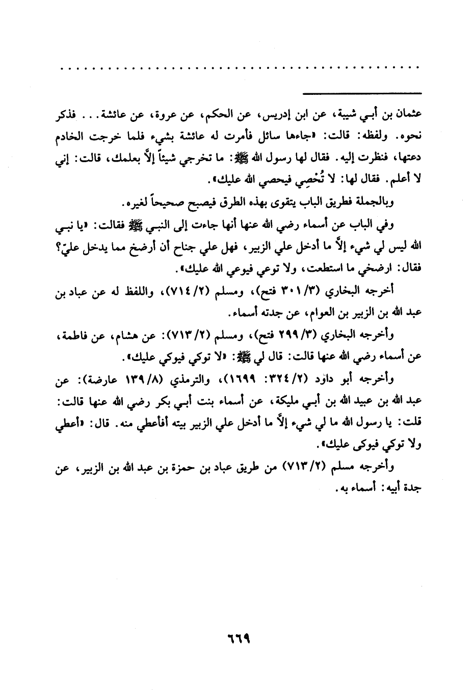 = عثمان بن أبي شيبة، عن ابن إدريس، عن الحكم، عن عروة، عن عائشة ... فذكر نحوه. ولفظه: قالت: "جاءها سائل فأمرت له عائشة بشيء فلما خرجت الخادم دعتها، فنظرت إليه. فَقَالَ لَهَا رَسُولُ اللَّهِ -صَلَّى اللَّهُ عَلَيْهِ وسلم-: ما تخرجي شيئًا إلَّا بعلمك، قالت: إني لا أعلم. فقال لها: لا تُحْصِي فيحصي الله عليك".