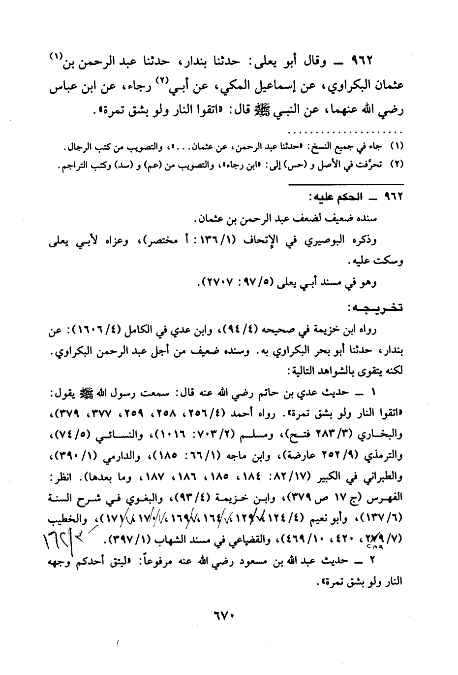 حَدَّثَنَا بُنْدَارٌ حدثنا عبد الرحمن بن عُثْمَانَ الْبَكْرَاوِيِّ عَنْ إِسْمَاعِيلَ الْمَكِّيِّ عَنْ أَبِي رَجَاءٍ عَنِ ابن عباس رَضِيَ الله عَنْهما عَنِ النَّبِيِّ صَلَّى اللَّهُ عَلَيْهِ وَسَلَّمَ قَالَ §اتَّقُوا النَّارَ وَلَوْ بِشِقِّ تَمْرَةٍ