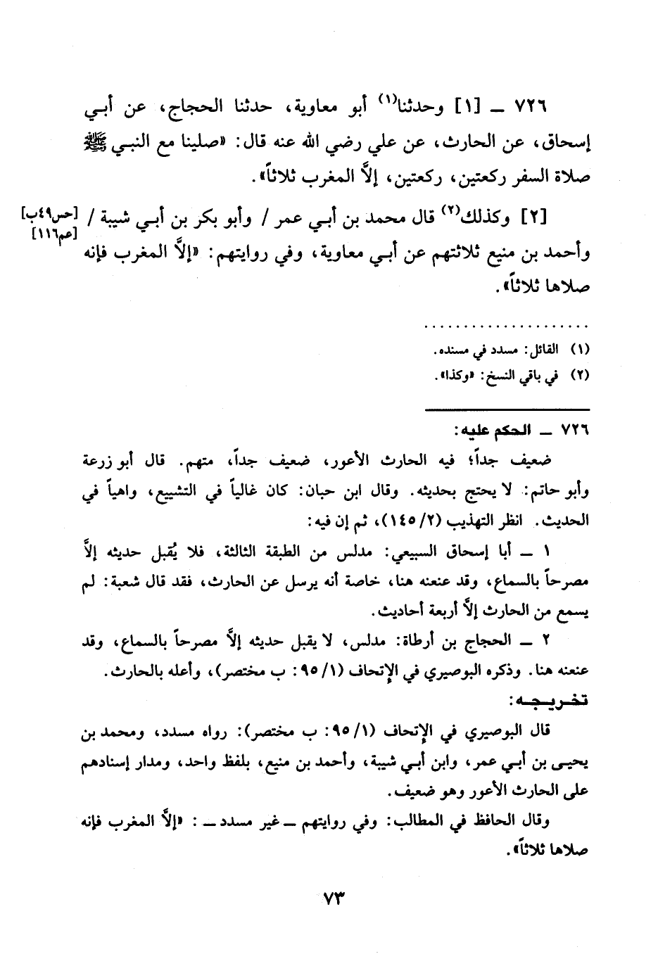 726 - وَحَدَّثَنَا أَبُو مُعَاوِيَةَ حَدَّثَنَا الْحَجَّاجُ عَنْ أَبِي إِسْحَاقَ عَنِ الْحَارِثِ عَنْ عَلِيٍّ رَضِيَ الله عَنْهُ قَالَ §صَلَّيْنَا مَعَ النَّبِيِّ صَلَّى اللَّهُ عَلَيْهِ وَسَلَّمَ صَلَاةَ السَّفَرِ رَكْعَتَيْنِ رَكْعَتَيْنِ إِلَّا الْمَغْرِبَ ثَلَاثًا وَكَذَلِكَ قَالَ مُحَمَّدُ بْنُ أَبِي عُمَرَ / وَأَبُو بَكْرِ بْنُ أَبِي شَيْبَةَ / وَأَحْمَدُ بْنُ مَنِيعٍ ثَلَاثَتُهُمْ عَنْ أَبِي مُعَاوِيَةَ وَفِي رِوَايَتِهِمْ إِلَّا الْمَغْرِبَ فَإِنَّهُ صَلَّاهَا ثَلَاثًا