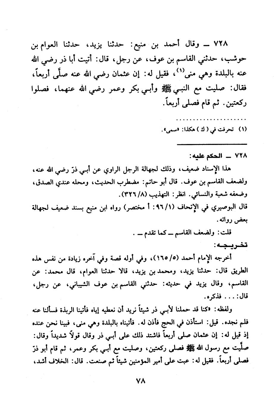 حَدَّثَنَا يَزِيدُ حَدَّثَنَا الْعَوَّامُ بْنُ حَوْشَبٍ حَدَّثَنِي الْقَاسِمُ بْنُ عَوْفٍ عَنْ رَجُلٍ قَالَ أَتَيْتُ أَبَا ذَرٍّ رَضِيَ الله عَنْهُ بِالْبَلْدَةِ وَهِيَ مِنًى فَقِيلَ لَهُ إِنَّ عُثْمَانَ رَضِيَ الله عَنْهُ صَلَّى أَرْبَعًا فَقَالَ §صَلَّيْتُ مَعَ النَّبِيِّ صَلَّى اللَّهُ عَلَيْهِ وَسَلَّمَ وَأَبِي بَكْرٍ وَعُمَرَ رَضِيَ الله عَنْهُمَا فَصَلَّوْا رَكْعَتَيْنِ ثُمَّ قَامَ فَصَلَّى أَرْبَعًا