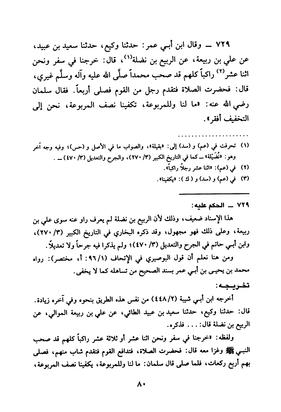 حَدَّثَنَا وَكِيعٌ حَدَّثَنَا سَعِيدُ بْنُ عُبَيْدٍ عَنْ عَلِيِّ بْنِ رَبِيعَةَ عَنِ الرَّبِيعِ بْنِ نَضْلَةَ قَالَ خَرَجْنَا فِي سَفَرٍ وَنَحْنُ اثْنَا عَشَرَ رَاكِبًا كُلُّهُمْ قَدْ صَحِبَ مُحَمَّدًا صَلَّى اللَّهُ عَلَيْهِ وَسَلَّمَ وَآلِهِ وَسَلَّمَ غَيْرِي قَالَ فَحَضَرَتِ الصَّلَاةُ فَتَقَدَّمَ رَجُلٌ مِنَ الْقَوْمِ فَصَلَّى أَرْبَعًا فَقَالَ سَلْمَانُ رَضِيَ الله عَنْهُ §مَا لَنَا وَلِلْمَرْبُوعَةِ تَكْفِينَا نِصْفُ الْمَرْبُوعَةِ نَحْنُ إِلَى التَّخْفِيفِ أَفْقَرُ
