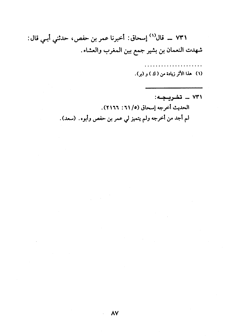 أَخْبَرَنَا عُمَرُ بْنُ حَفْصٍ حَدَّثَنِي أَبِي قَالَ §شَهِدْتُ النُّعْمَانَ بْنَ بَشِيرٍ جَمَعَ بَيْنَ الْمَغْرِبِ وَالْعِشَاءِ