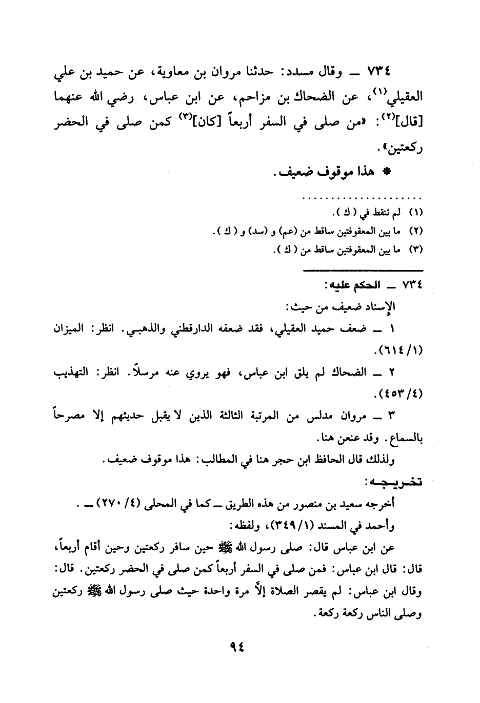 حَدَّثَنَا مَرْوَانُ بْنُ مُعَاوِيَةَ عَنْ حُمَيْدِ بْنِ عَلِيٍّ الْعُقَيْلِيِّ عَنِ الضَّحَّاكِ بْنِ مُزَاحِمٍ عَنِ ابْنِ عَبَّاسٍ رَضِيَ الله عَنْهُمَا قَالَ §مَنْ صَلَّى فِي السَّفَرِ أَرْبَعًا كَانَ كَمَنْ صَلَّى فِي الْحَضَرِ رَكْعَتَيْنِ