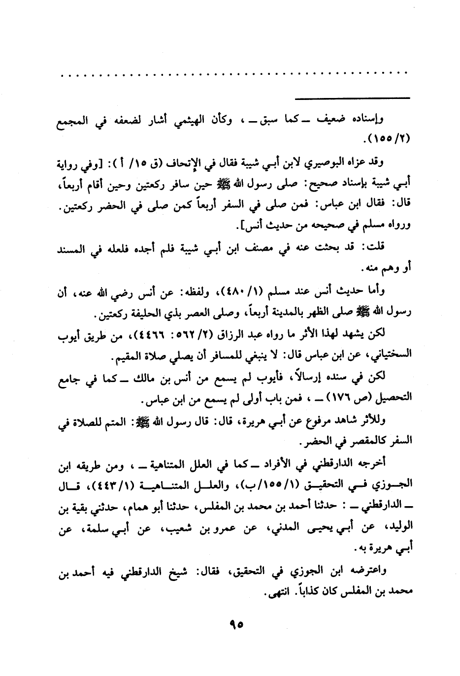 وقد عزاه البوصيري لابن أبي شيبة فقال في الإِتحاف (ق 15/ أ): [وفي رواية أبي شيبة بإِسناد صحيح: صَلَّى رَسُولُ اللَّهِ -صَلَّى اللَّهُ عَلَيْهِ وَسَلَّمَ- حين سافر ركعتين وحين أقام أربعًا، قال: فقال ابن عباس: فمن صلى في السفر أربعًا كمن صلى في الحضر ركعتين. ورواه مسلم في صحيحه من حديث أنس].