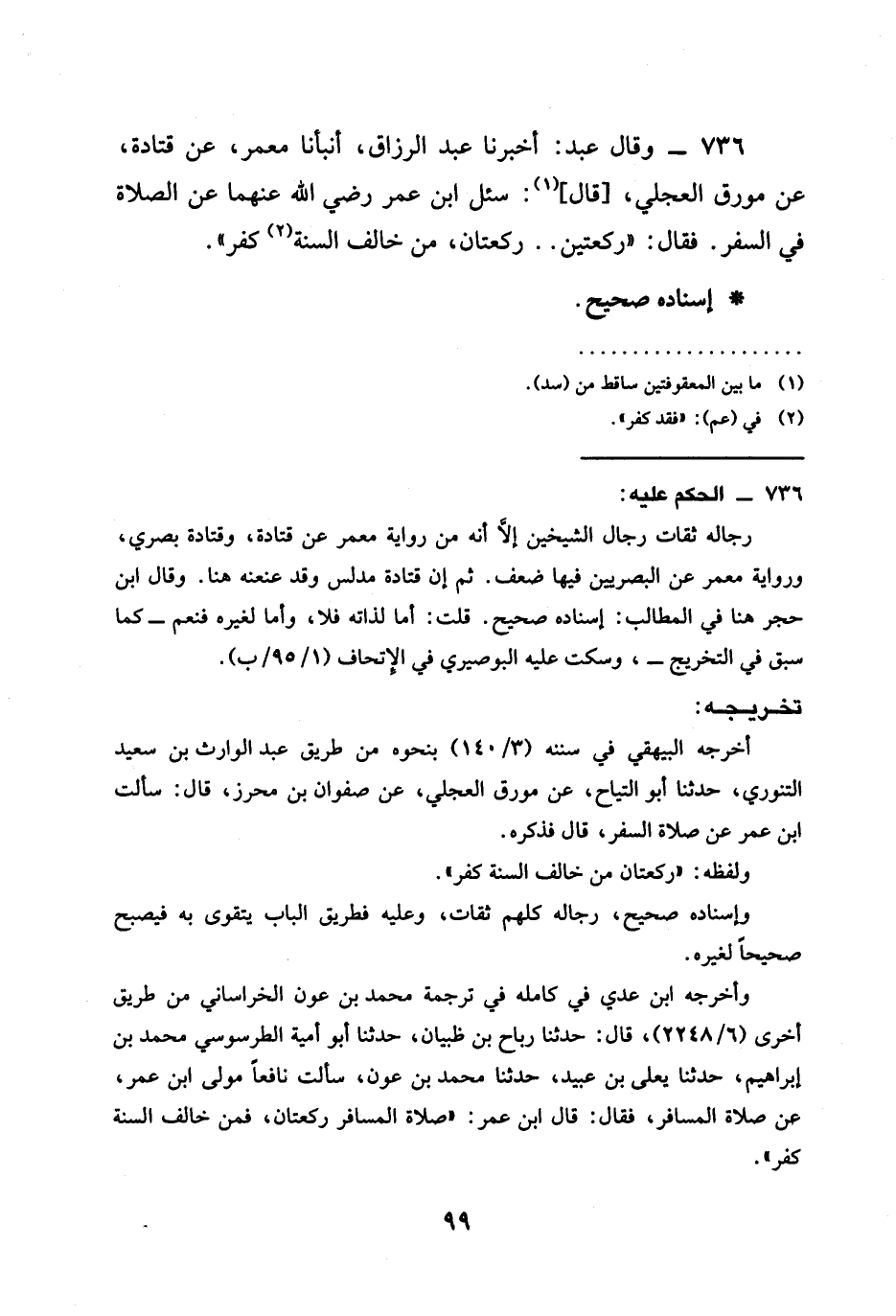 أَخْبَرَنَا عَبْدُ الرَّزَّاقِ أَنْبَأَنَا مَعْمَرُ عَنْ قَتَادَةَ عَنْ مُوَرِّقٍ الْعِجْلِيِّ قَالَ سُئِلَ ابْنُ عُمَرَ رَضِيَ اللَّهُ عنهما عَنِ الصرة فِي السَّفَرِ فَقَالَ §رَكْعَتَيْنِ ... ركعتان مَنْ خَالَفَ السُّنَّةَ كَفَرَ