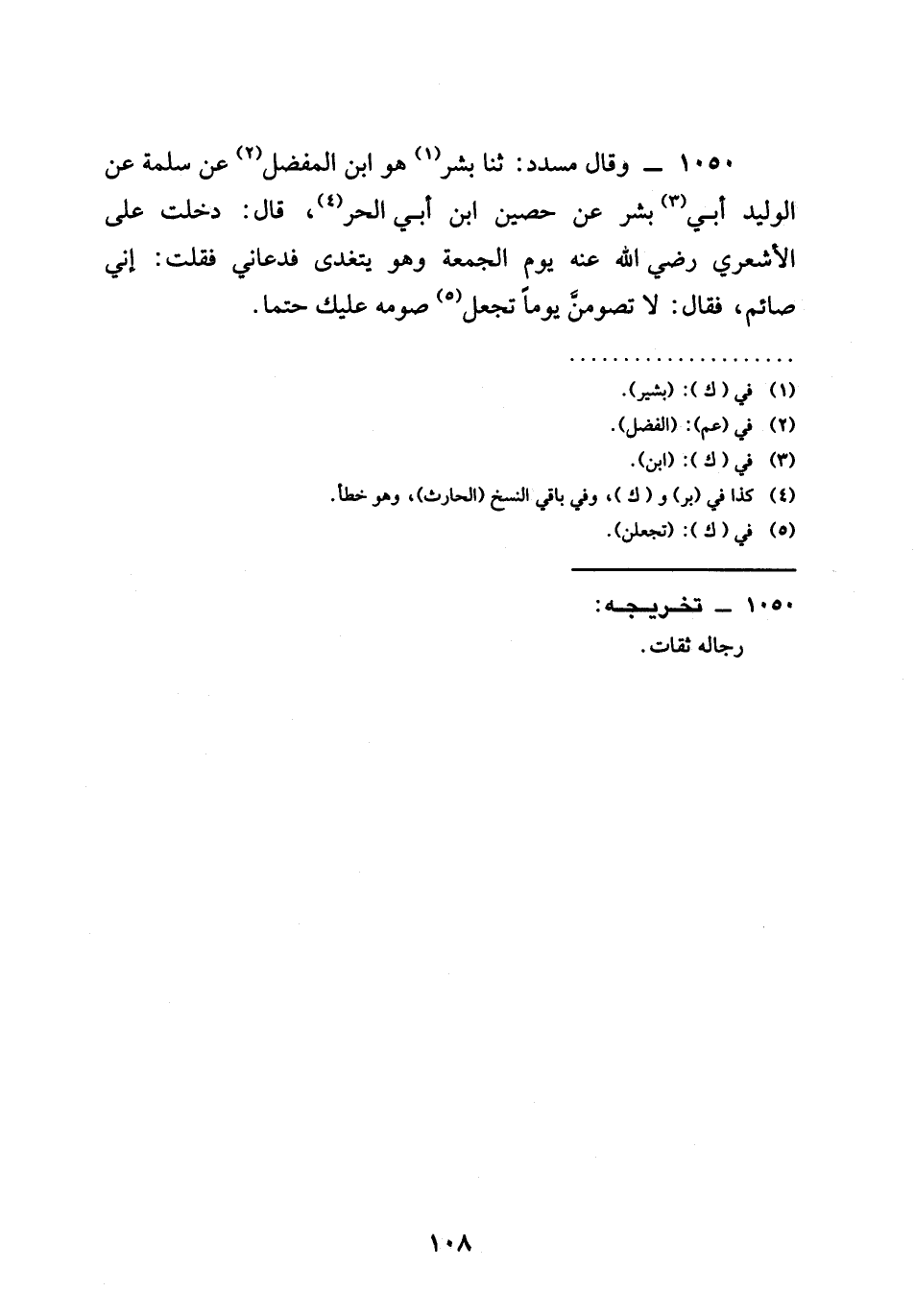 1050 - وَقَالَ مُسَدَّدٌ، ثنا بِشْرٌ هُوَ ابْنُ الْمُفَضَّلِ، عَنْ سَلَمَةَ، عَنِ الْوَلِيدِ أبي بِشْر، عَنْ حُصَيْنِ ابْنِ أَبِي الْحَرِّ، قَالَ: " دَخَلْتُ عَلَى الْأَشْعَرِيِّ رَضِيَ الله عَنْه يَوْمَ الْجُمُعَةِ وَهُوَ يَتَغَدَّى، فَدَعَانِي، فَقُلْتُ: إِنِّي صَائِمٌ "، فَقَالَ: " §لَا تَصُومَنَّ يَوْمًا تَجْعَل صَوْمَهُ عَلَيْكَ حَتْمًا "
