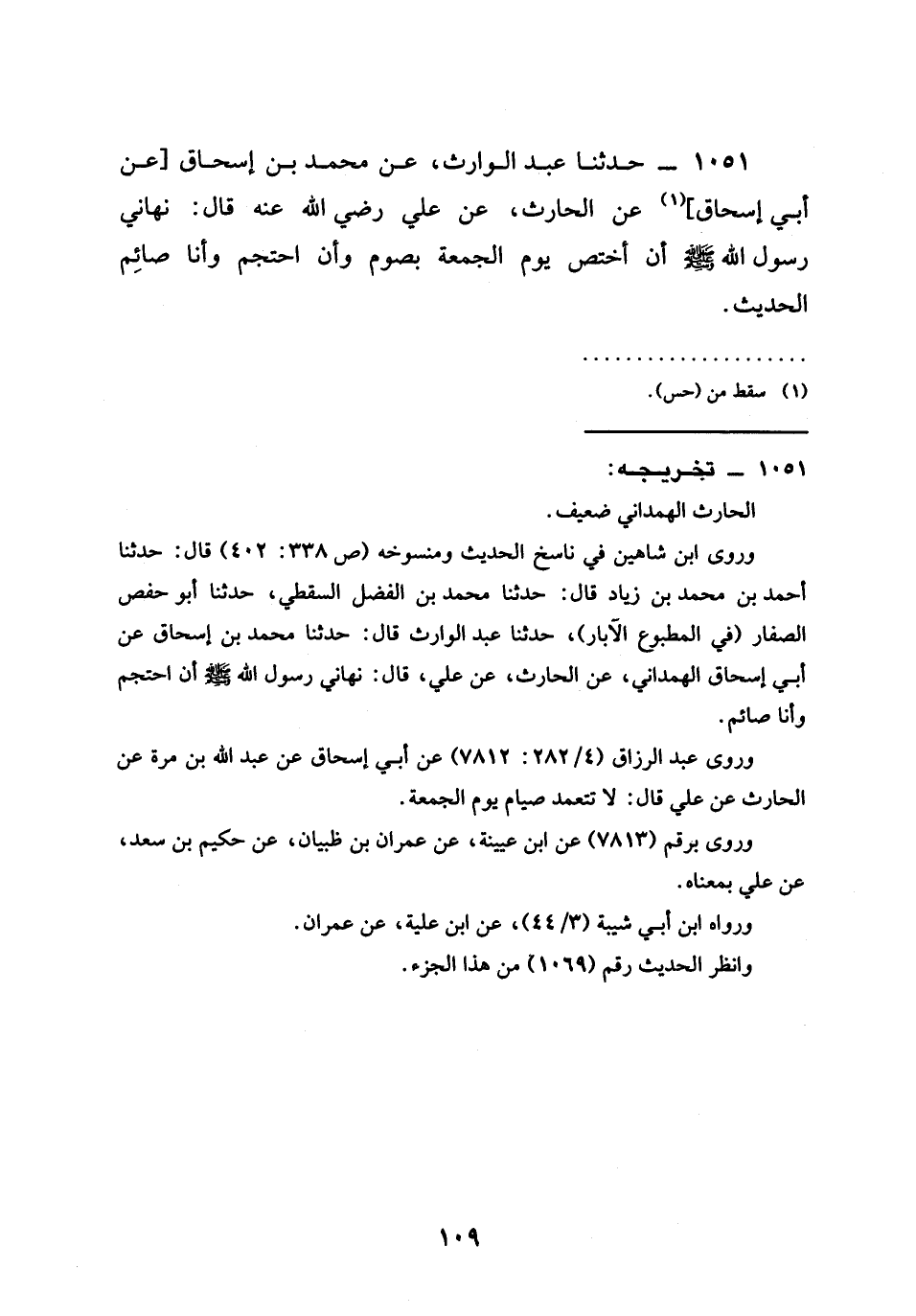 1051 - حَدَّثَنَا عَبْدُ الْوَارِثِ عَنْ مُحَمَّدِ بْنِ إِسْحَاقَ عَنْ أَبِي إِسْحَاقَ عَنِ الْحَارِثِ عن علي رَضِيَ الله عَنْه قَالَ §نَهَانِي رَسُولُ اللَّهِ صَلَّى اللَّهُ عَلَيْهِ وَسَلَّمَ أَنْ أَخْتَصَّ يَوْمَ الْجُمُعَةِ بِصَوْمٍ وَأَنْ أَحْتَجِمَ وَأَنَا صَائِمٌ الْحَدِيثَ