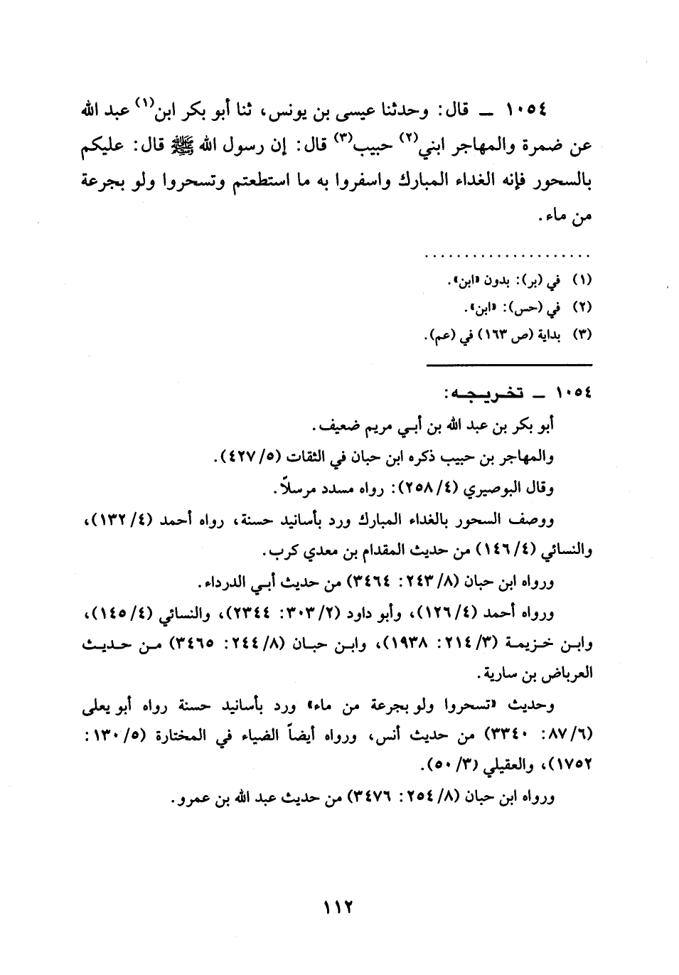 1054 - قَالَ وَحَدَّثَنَا عِيسَى بْنُ يُونُسَ ثنا أَبُو بَكْرِ ابن عَبْدِ اللَّهِ عَنْ ضمرة والمهاجر ابني حَبِيبٍ قَالَ إِنَّ رَسُولَ اللَّهِ صَلَّى اللَّهُ عَلَيْهِ وَسَلَّمَ قَالَ §عليكم بالسحور فإن الْغَدَاءُ الْمُبَارَكُ وَأَسْفِرُوا بِهِ مَا اسْتَطَعْتُمْ وَتَسَحَّرُوا وَلَوْ بِجُرْعَةٍ مِنْ مَاءٍ