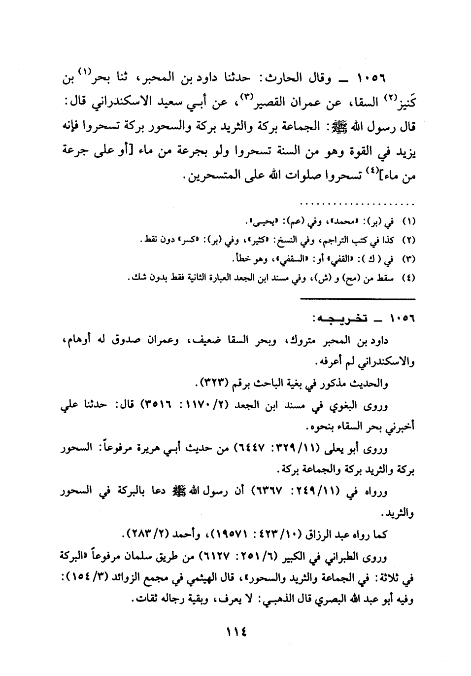 1056 - وَقَالَ الْحَارِثُ حَدَّثَنَا دَاوُدُ بْنُ الْمُحَبَّرِ ثنا بَحْرُ بْنُ كَنِيزٍ السقا عَنْ عِمْرَانَ الْقَصِيرِ عَنْ أَبِي سَعِيدٍ الْإِسْكَنْدَرَانِيِّ قَالَ قَالَ رَسُولُ اللَّهِ صَلَّى اللَّهُ عَلَيْهِ وَسَلَّمَ §الْجَمَاعَةُ بَرَكَةَ وَالثَّرِيدُ بَرَكَةَ وَالسَّحُورُ بَرَكَةٌ تَسَحَّرُوا فَإِنَّهُ يَزِيدُ فِي الْقُوَّةِ وَهُوَ مِنَ السُّنَّةِ تَسَحَّرُوا وَلَوْ بِجُرْعَةٍ من ماء أو على جدعه مِنْ مَاءٍ تَسَحَّرُوا صَلَوَاتُ اللَّهِ عَلَى الْمُتَسَحِّرِينَ