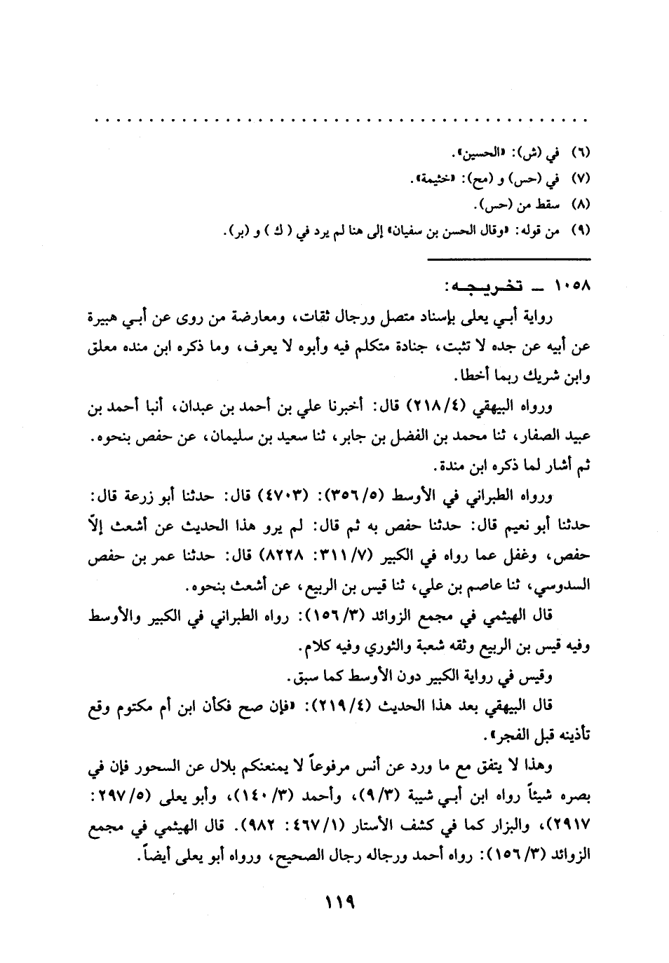 وهذا لا يتفق مع ما ورد عن أنس مرفوعًا لا يمنعنكم بلال عن السحور فإن في بصره شيئًا رواه ابن أبي شيبة (3/ 9)، وأحمد (3/ 140)، وأبو يعلى (5/ 297: 2917)، والبزار كما في كشف الأستار (1/ 467: 982). قال الهيثمي في مجمع الزوائد (3/ 156): رواه أحمد ورجاله رجال الصحيح، ورواه أبو يعلى أيضًا.