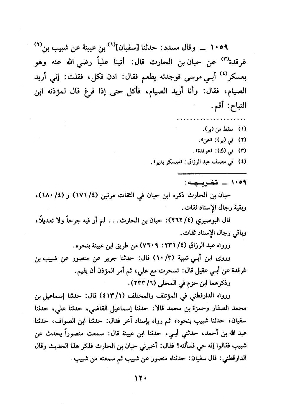 1059 - وَقَالَ مُسَدَّدٌ حدثنا سُفْيَانُ بْنُ عينة عَنْ شَبِيبِ بْنِ غَرْقَدَةَ عَنْ حَبَّانَ بْنِ الْحَارِثِ قَالَ أتينا عليا رَضِيَ الله عَنْه وَهُوَ بِعَسْكَرِ أَبِي مُوسَى فَوَجَدْتُهُ يَطْعَمُ فَقَالَ §ادْنُ فَكُلْ فَقُلْتُ إِنِّي أُرِيدُ الصِّيَامَ فَقَالَ وَأَنَا أُرِيدُ الصِّيَامَ فَأَكَلَ حَتَّى إِذَا فَرَغَ قَالَ لِمُؤَذِّنِهِ ابْنِ النَّبَّاحِ أَقِمْ