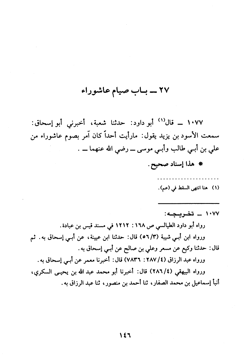 1077 - قَالَ أَبُو دَاوُدَ حَدَّثَنَا شُعْبَةُ أَخْبَرَنِي أَبُو إِسْحَاقَ سَمِعْتُ الْأَسْوَدَ بْنَ يَزِيدَ يَقُولُ §مَا رَأَيْتُ أَحَدًا كان آمر بصوم عَاشُورَاءَ مِنْ عَلِيِّ بْنِ أَبِي طَالِبٍ وأبي موسى رَضِيَ الله عَنْهما