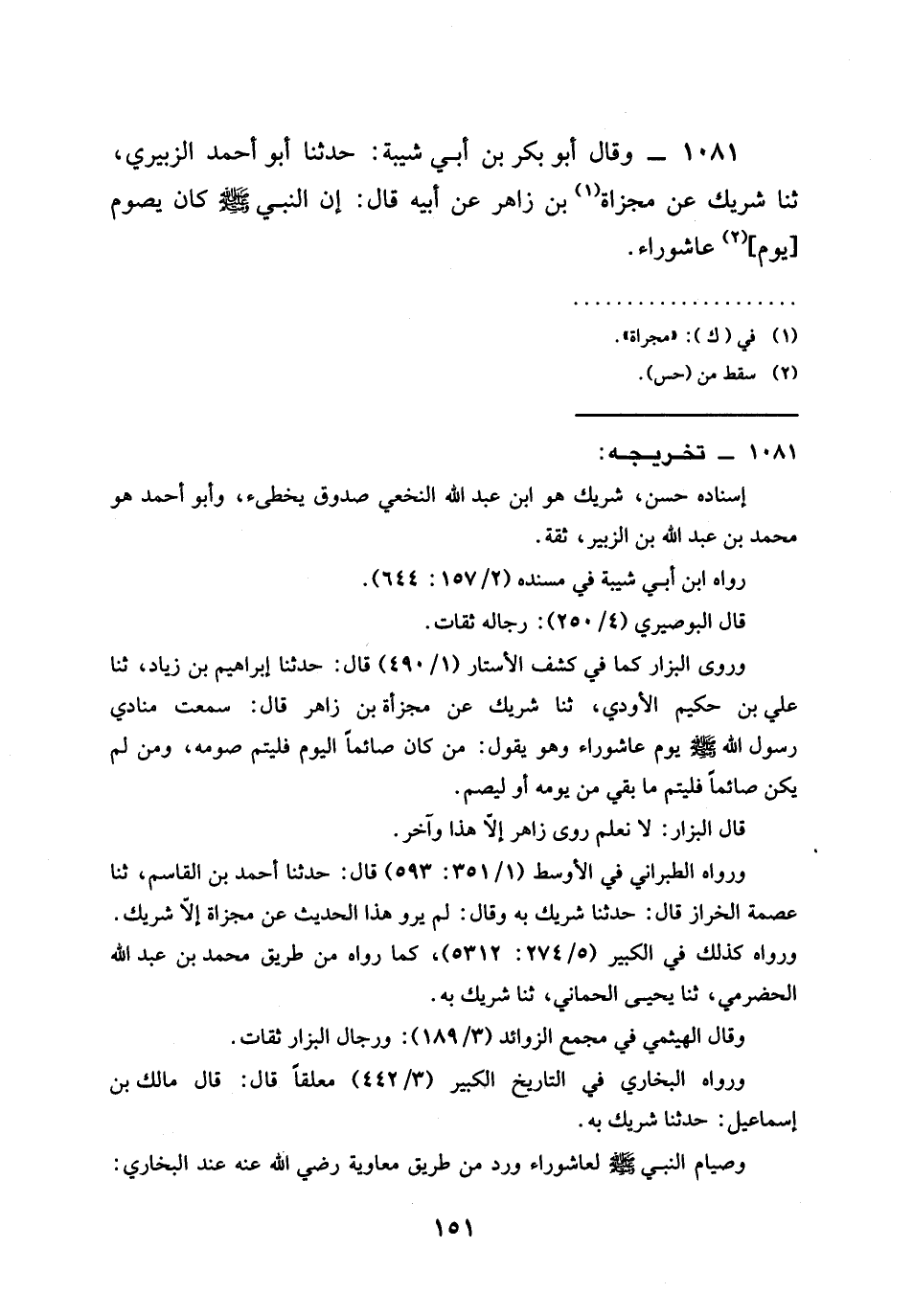 1081 - وَقَالَ أَبُو بَكْرِ بْنُ أَبِي شَيْبَةَ حَدَّثَنَا أَبُو أَحْمَدَ الزُّبَيْرِيُّ ثنا شَرِيكٌ عَنْ مَجْزَأَةَ بْنِ زَاهِرٍ عَنْ أبيه قال أَنَّ §النَّبِيَّ صَلَّى اللَّهُ عَلَيْهِ وَسَلَّمَ كان يصوم يوم عَاشُورَاءَ