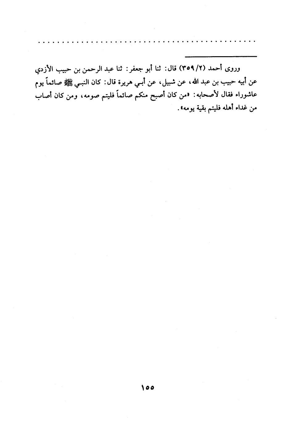 = وروى أحمد (2/ 359) قال: ثنا أبو جعفر: ثنا عبد الرحمن بن حبيب الأزدي عن أبيه حبيب بن عبد الله، عن شبيل، عَنْ أَبِي هُرَيْرَةَ قَالَ: كَانَ النَّبِيُّ -صَلَّى اللَّهُ عَلَيْهِ وَسَلَّمَ- صائمًا يوم عاشوراء فقال لأصحابه: "من كان أصبح منكم صائمًا فليتم صومه، ومن كان أصاب من غداء أهله فليتم بقية يومه".