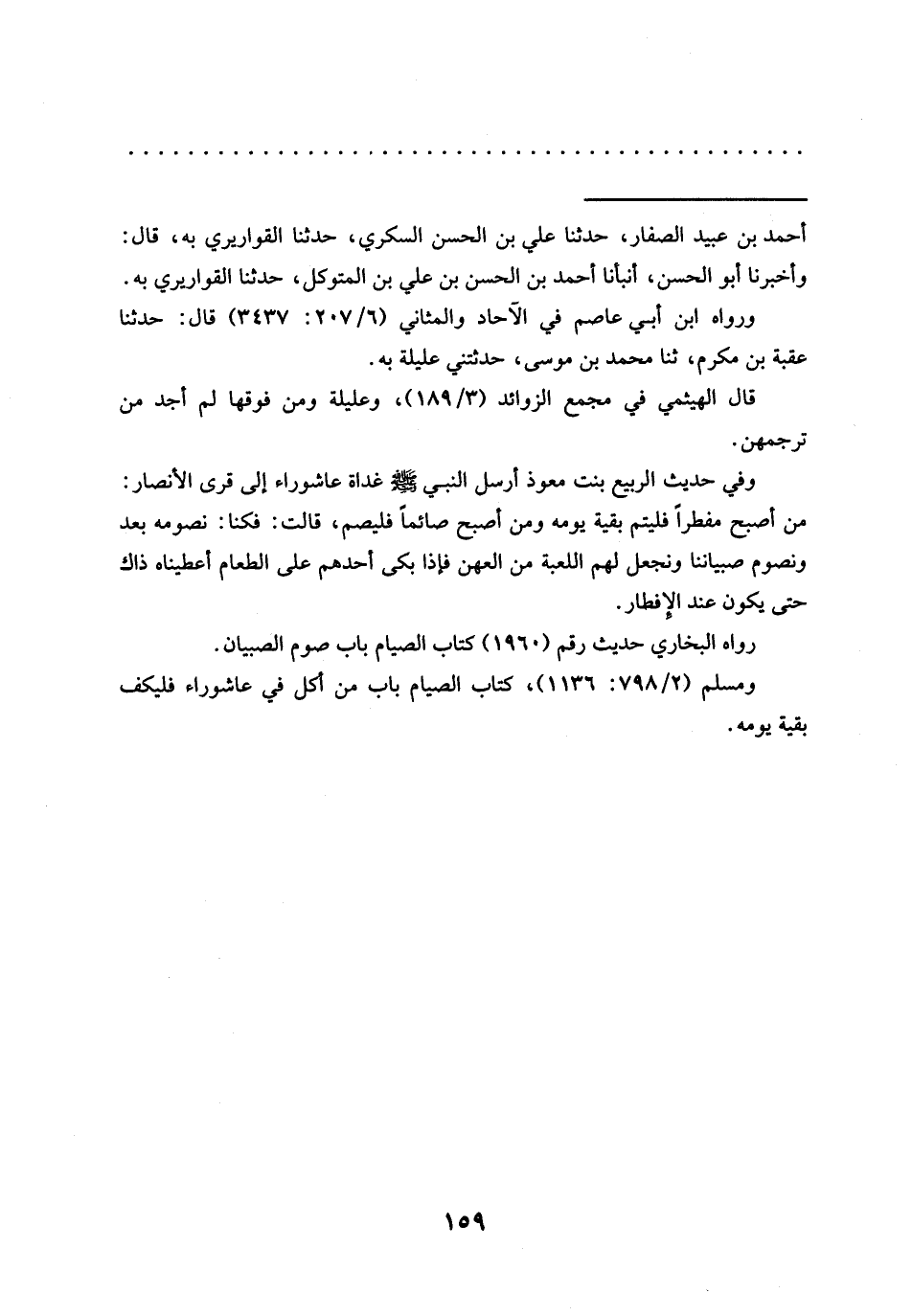 وفي حديث الربيع بنت معوذ أرسل النبي -صلى الله عليه وسلم- غداة عاشوراء إلى قرى الأنصار: من أصبح مفطرًا فليتم بقية يومه ومن أصبح صائمًا فليصم، قالت: فإنا: نصومه بعد ونصوم صبياننا ونجعل لهم اللعبة من العهن فهذا بكى أحدهم على الطعام أعطيناه ذاك حتى يكون عند الإفطار.