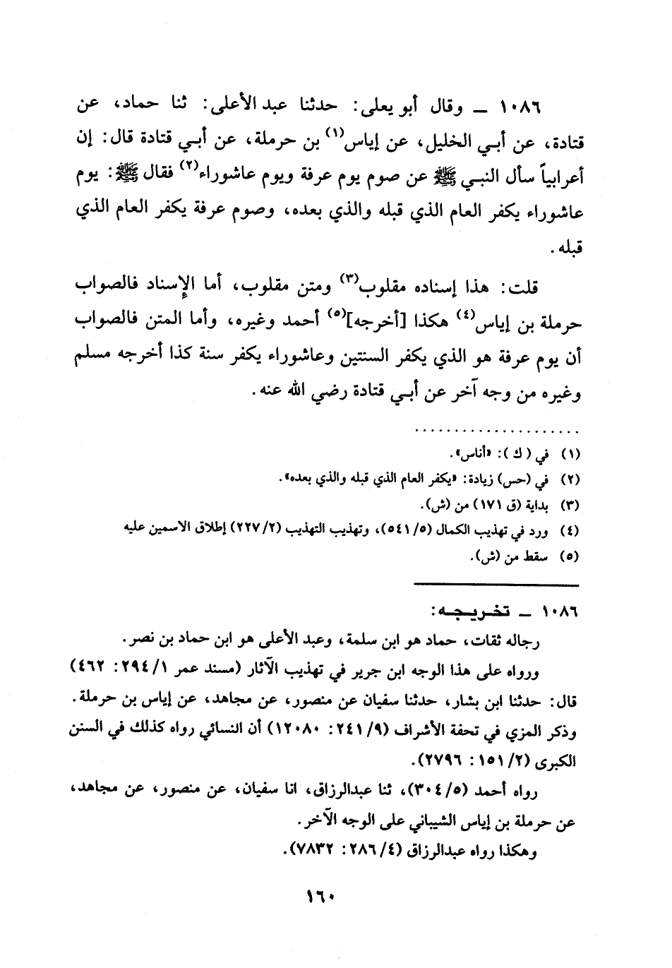 1086 - وَقَالَ أَبُو يَعْلَى حَدَّثَنَا عبد الأعلى ثنا حَمَّادِ عَنْ قتادة عن أَبِي الْخَلِيلِ عَنْ إِيَاسِ بْنِ حَرْمَلَةَ عَنْ أبي قتادة قال أَنَّ أَعْرَابِيًّا سَأَلَ النَّبِيَّ صَلَّى اللَّهُ عَلَيْهِ وَسَلَّمَ عَنْ صَوْمِ يَوْمِ عَرَفَةَ §وَيَوْمِ عَاشُورَاءَ فَقَالَ صَلَّى اللَّهُ عَلَيْهِ وَسَلَّمَ يَوْمُ عَاشُورَاءَ يُكَفِّرُ الْعَامَ الَّذِي قَبْلَهُ وَالَّذِي بَعْدَهُ وَصَوْمُ عَرَفَةَ يُكَفِّرُ الْعَامَ الَّذِي قَبْلَهُ قُلْتُ هَذَا إسناده مَقْلُوبٌ وَمَتْنٌ مَقْلُوبٌ أَمَّا الْإِسْنَادُ فَالصَّوَابُ حَرْمَلَةُ بن إياس هكذا أَخْرَجَهُ أَحْمَدُ وَغَيْرُهُ وَأَمَّا الْمَتْنُ فَالصَّوَابُ أَنَّ يوم عرفة هو الذي يُكَفِّرُ السَّنَتَيْنِ وَعَاشُورَاءَ يُكَفِّرُ سَنَةً كَذَا أَخْرَجَهُ مُسْلِمٌ وَغَيْرُهُ مِنْ وَجْهٍ آخَرَ عَنْ أبي قتادة رَضِيَ الله عَنْه