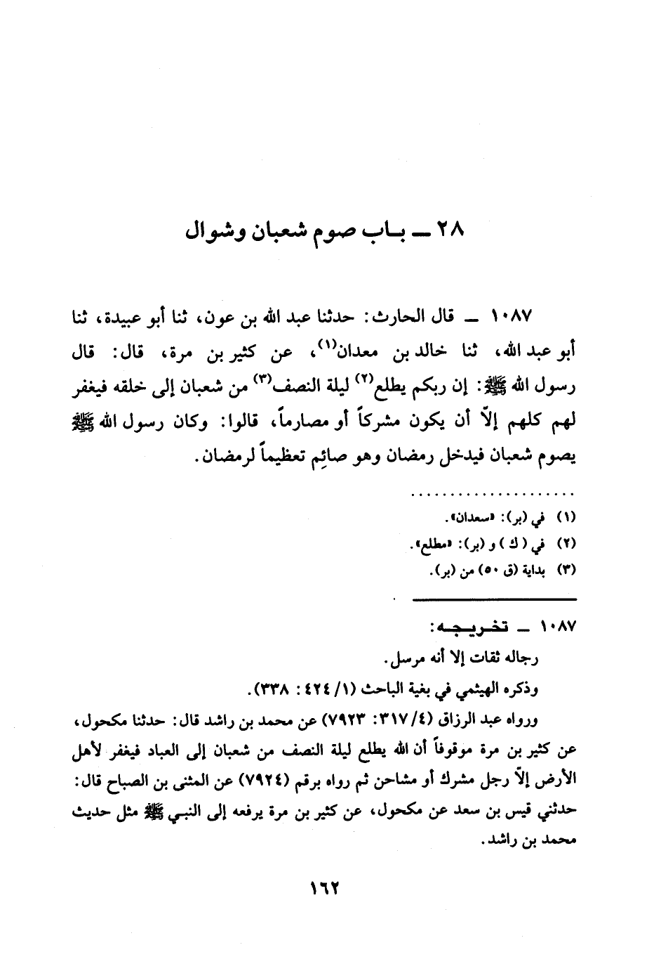 1087 - قَالَ الْحَارِثُ حَدَّثَنَا عَبْدُ اللَّهِ بْنُ عَوْنٍ ثنا أَبُو عبيدة ثنا أبو عَبْدِ اللَّهِ ثنا خَالِدُ بْنُ مَعْدَانَ عَنْ كَثِيرِ بْنِ مُرَّةَ قَالَ قَالَ رَسُولُ اللَّهِ صَلَّى اللَّهُ عَلَيْهِ وَسَلَّمَ إِنَّ §رَبَّكُمْ يَطَّلِعُ لَيْلَةَ النِّصْفِ مِنْ شَعْبَانَ إِلَى خَلْقِهِ فَيَغْفِرُ لَهُمْ كُلِّهِمْ إِلَّا أَنْ يَكُونَ مُشْرِكًا أَوْ مُصَارِمًا قَالُوا وَكَانَ رَسُولُ اللَّهِ صَلَّى اللَّهُ عَلَيْهِ وَسَلَّمَ يَصُومُ شَعْبَانَ فَيَدْخُلُ رَمَضَانُ وَهُوَ صَائِمٌ تَعْظِيمًا لِرَمَضَانَ