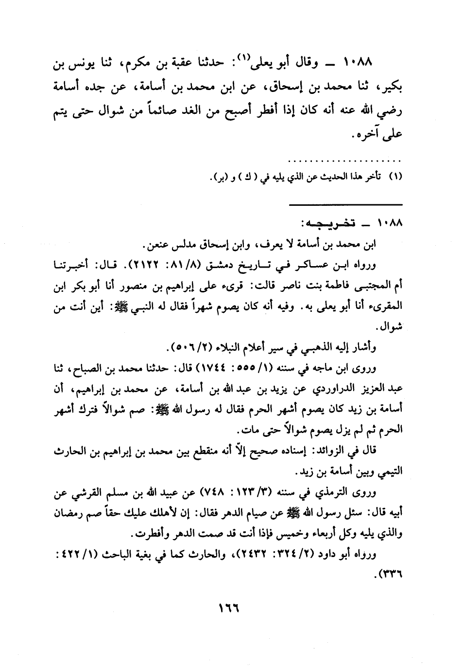1088 - وَقَالَ أَبُو يَعْلَى حَدَّثَنَا عُقْبَةُ بْنُ مُكْرَمٍ ثنا يُونُسُ بْنُ بُكَيْرٍ ثنا مُحَمَّدُ بْنُ إِسْحَاقَ عَنِ ابْنِ مُحَمَّدِ بْنِ أُسَامَةَ عَنْ جده أسامة رَضِيَ الله عَنْه أَنَّهُ كَانَ §إِذَا أَفْطَرَ أَصْبَحَ مِنَ الغد صائما ن شَوَّالٍ حَتَّى يَتِمَّ عَلَى آخِرِهِ