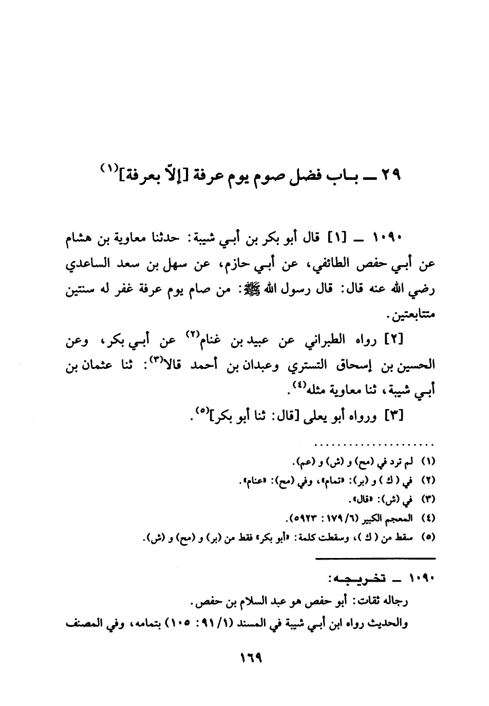 1090 -[1] قَالَ أَبُو بَكْرِ بْنُ أَبِي شَيْبَةَ حَدَّثَنَا مُعَاوِيَةُ بْنُ هِشَامٍ عَنْ أَبِي حَفْصٍ الطَّائِفِيِّ عَنْ أَبِي حَازِمٍ عَنْ سَهْلِ بْنِ سعد الساعدي رَضِيَ الله عَنْه قَالَ قَالَ رَسُولُ صَلَّى اللَّهُ عَلَيْهِ وَسَلَّمَ §مَنْ صَامَ يَوْمَ عَرَفَةَ غُفِرَ لَهُ سَنَتَيْنِ متتعابعتين