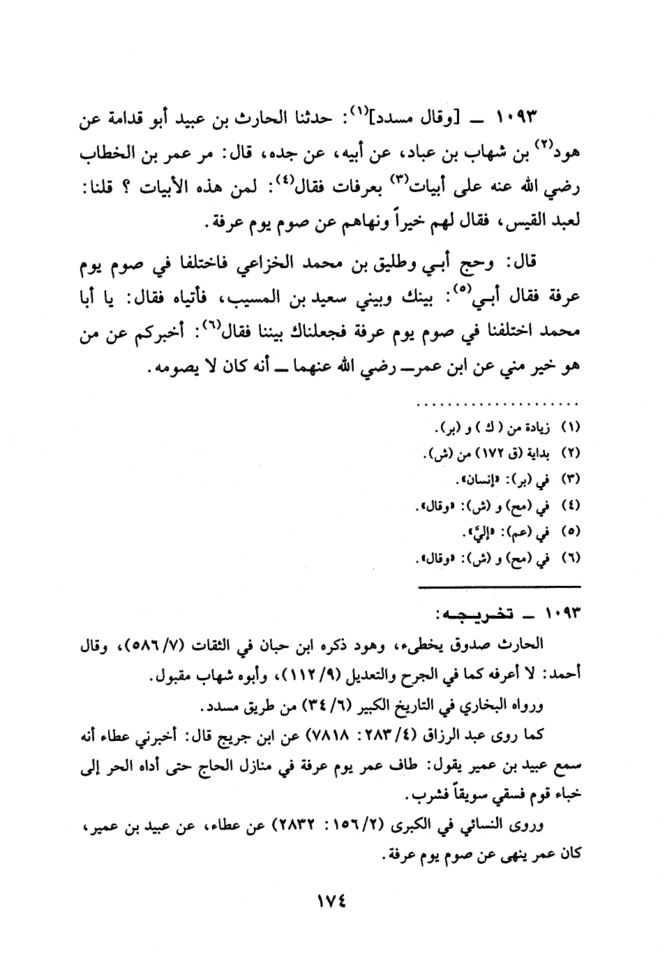 1093 - وَقَالَ مسدد حَدَّثَنَا الْحَارِثُ بْنُ عُبَيْدٍ أَبُو قُدَامَةَ عَنْ هُودِ بْنِ شِهَابِ بْنِ عَبَّادٍ عَنْ أَبِيهِ عَنْ جَدِّهِ قَالَ مَرَّ عُمَرُ بن الخطاب رَضِيَ الله عَنْه عَلَى أَبْيَاتٍ بِعَرَفَاتٍ فَقَالَ §لِمَنْ هَذِهِ الْأَبْيَاتُ قُلْنَا لِعَبْدِ الْقَيْسِ فَقَالَ لَهُمْ خَيْرًا وَنَهَاهُمْ عن صوم يوم عَرَفَةَ