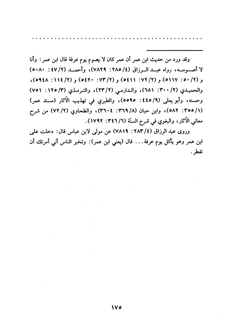 = وقد ورد من حديث ابن عمر أن عمر كان لا يصوم يوم عرفة قال ابن عمر: وأنا لا أصومه، رواه عبد الرزاق (4/ 285: 7829)، وأحمد (2/ 47: 5080) و (2/ 50: 5117) و (2/ 72: 5411) و (2/ 73: 5420) و (2/ 114: 5948)، والحميدي (2/ 300: 681)، والدارمي (2/ 23)، والترمذي (3/ 125: 751) وحسنه، وأبو يعلى (9/ 445: 5595)، والطبري في تهذيب الآثار (مسند عمر) (1/ 355: 582)، وابن حبان (8/ 369: 3604)، والطحاوي (2/ 72) من شرح معاني الآثار, والبغوي في شرح السنّة (6/ 346: 1792).