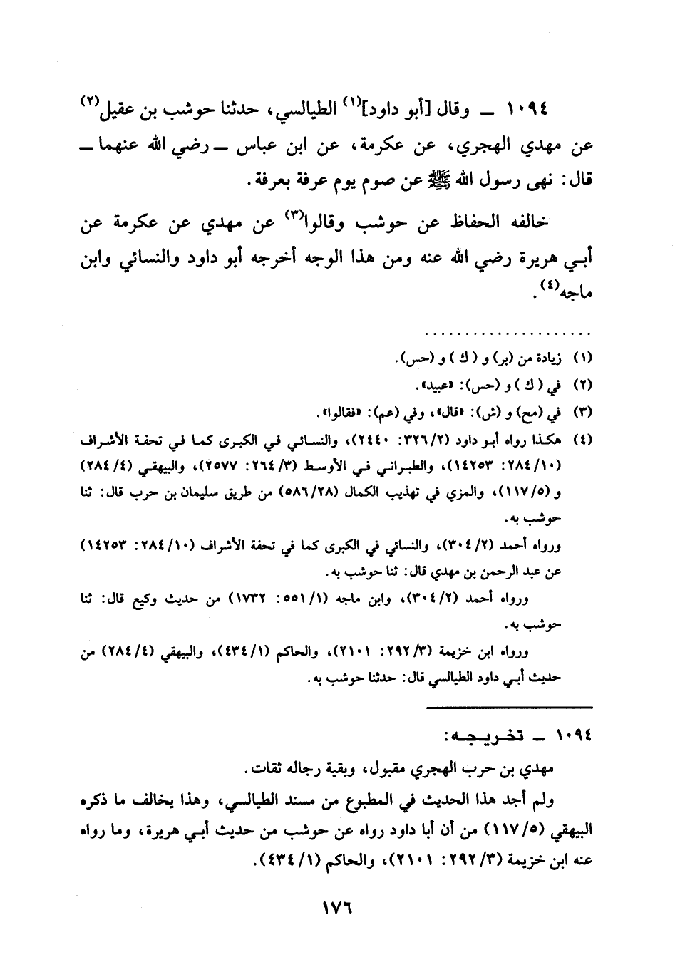1094 - وَقَالَ أَبُو دَاوُدَ الطَّيَالِسِيُّ حَدَّثَنَا حَوْشَبُ بْنُ عَقِيلٍ عَنْ مَهْدِيٍّ الْهَجَرِيِّ عَنْ عِكْرِمَةَ عَنِ ابن عباس رَضِيَ الله عَنْهما قَالَ §نَهَى رَسُولُ اللَّهِ صَلَّى اللَّهُ عَلَيْهِ وَسَلَّمَ عَنْ صَوْمِ يَوْمِ عَرَفَةَ بِعَرَفَةَ