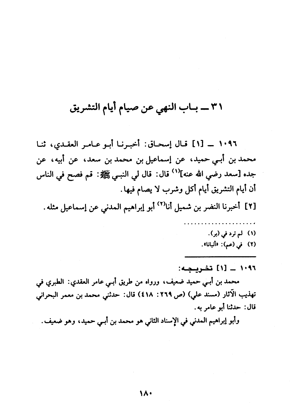 1096 -[1] قَالَ إِسْحَاقُ أَخْبَرَنَا أَبُو عَامِرٍ الْعَقَدِيُّ ثنا مُحَمَّدُ بْنُ أَبِي حُمَيْدٍ عَنْ إِسْمَاعِيلَ بْنِ محمد بن سد عَنْ أَبِيهِ عَنْ جده سعد رَضِيَ الله عَنْه قَالَ قَالَ لِي النَّبِيُّ صَلَّى اللَّهُ عَلَيْهِ وَسَلَّمَ قُمْ فَصِحْ فِي النَّاسِ أَنَّ §أَيَّامَ التَّشْرِيقِ أَكْلٍ وَشُرْبٍ لَا يُصَامُ فِيهَا