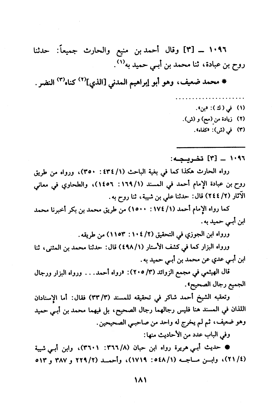 1096 - [3] وَقَالَ أَحْمَدُ بْنُ مَنِيعٍ وَالْحَارِثُ جَمِيعًا: حَدَّثَنَا رَوْحُ بْنُ عُبَادَةَ، ثنا محمَّد بْنُ أَبِي حُمَيْدٍ بِهِ (¬1).