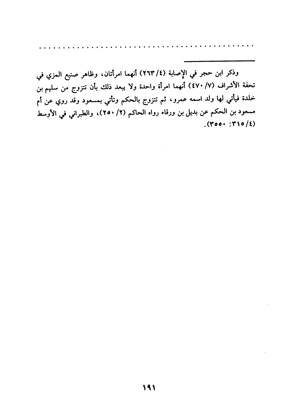 = وذكر ابن حجر في الإصابة (4/ 263) أنهما امرأتان، وظاهر صنيع المزي في تحفة الأشراف (7/ 470) أنهما امرأة واحدة ولا يبعد ذلك بأن تتزوج من سليم بن خلدة فيأتي لها ولد اسمه عمرو، ثم تتزوج بالحكم وتأتي بمسعود وقد روي عن أم مسعود بن الحكم عن بديل بن ورقاء رواه الحاكم (2/ 250)، والطبراني في الأوسط (4/ 315: 3550).