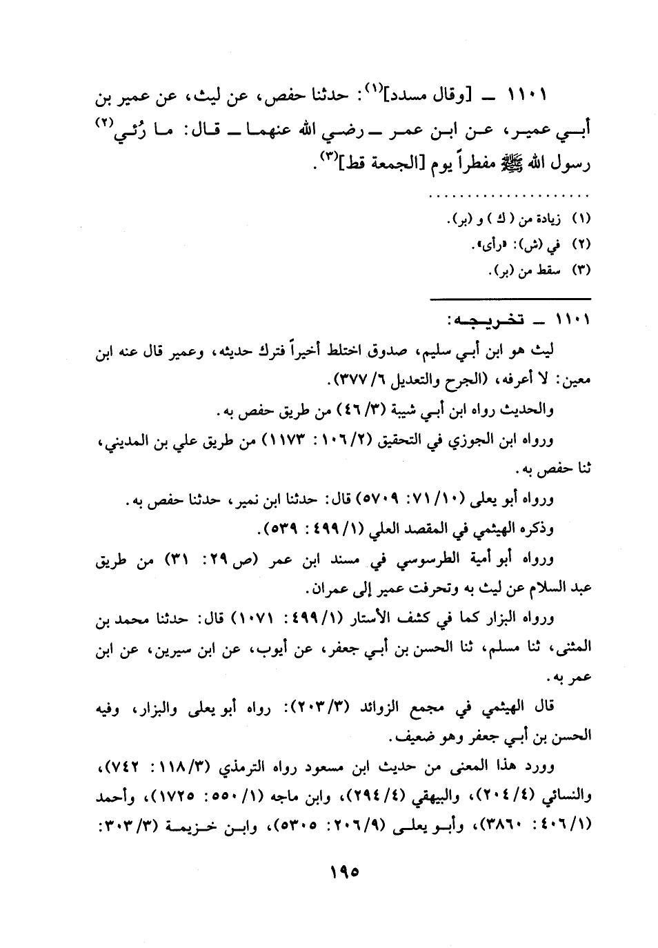 1101 - وَقَالَ مُسَدَّدٌ حَدَّثَنَا حَفْصٌ عَنْ لَيْثٍ عَنْ عُمَيْرِ بْنِ أَبِي عُمَيْرٍ عَنِ ابن عمر رَضِيَ الله عَنْهما قَالَ §مَا رُئِيَ رَسُولُ اللَّهِ صَلَّى اللَّهُ عَلَيْهِ وَسَلَّمَ مُفْطِرًا يَوْمَ الْجُمُعَةِ قَطُّ