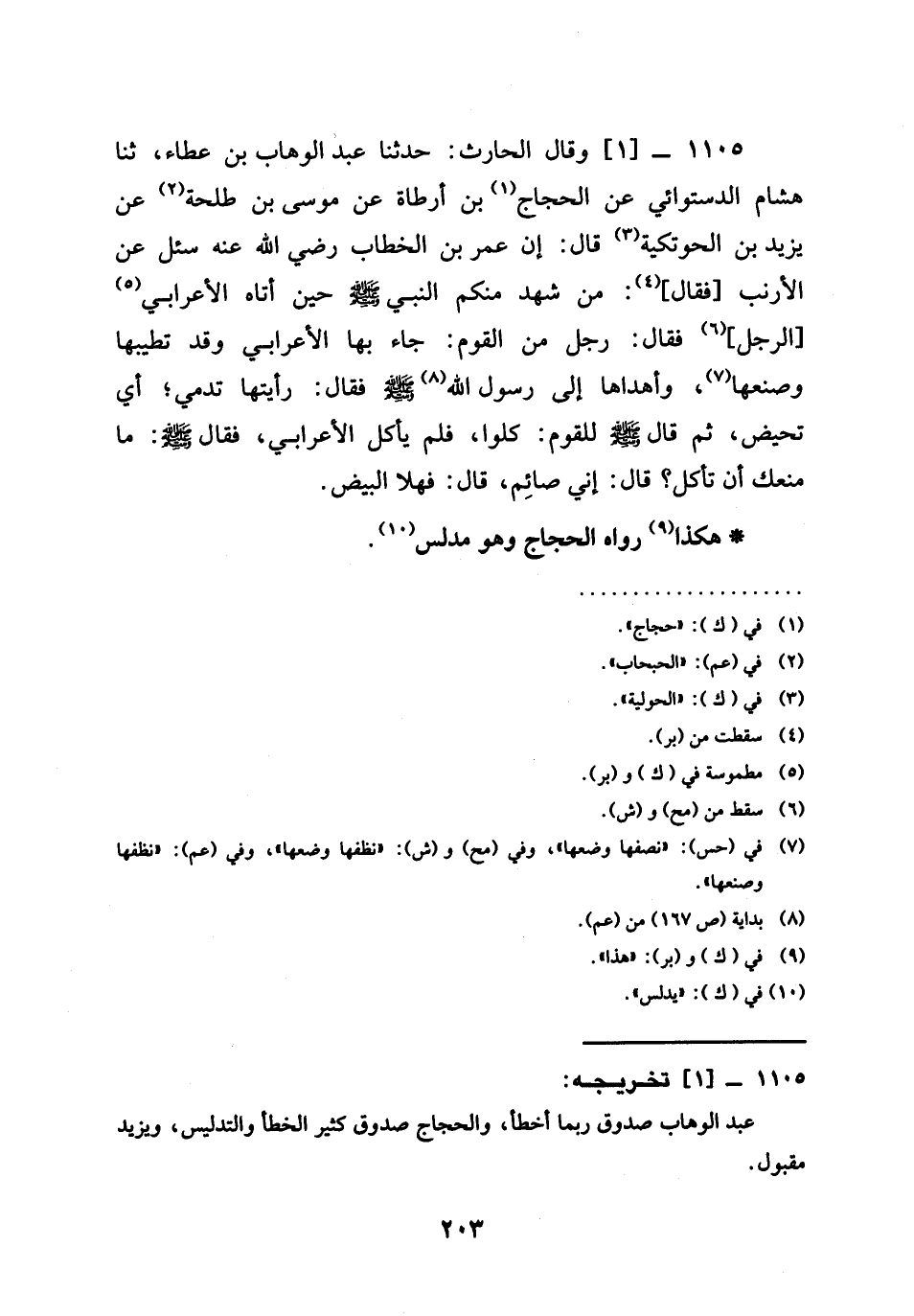 1105 -[1] وَقَالَ الْحَارِثُ حَدَّثَنَا عَبْدُ الْوَهَّابِ بْنُ عَطَاءٍ ثنا هِشَامٌ الدَّسْتُوَائِيُّ عَنِ الْحَجَّاجِ بْنِ أَرْطَأَةَ عَنْ مُوسَى بْنِ طَلْحَةَ عَنْ يَزِيدَ بن الحوتكية قال أَنَّ عُمَرَ بن الخطاب رَضِيَ الله عَنْه سُئِلَ عَنِ الْأَرْنَبِ فَقَالَ مَنْ شَهِدَ مِنْكُمْ النَّبِيَّ صَلَّى اللَّهُ عَلَيْهِ وَسَلَّمَ حِينَ أتاه الأعرابي الرجل فَقَالَ رَجُلٌ مِنَ الْقَوْمِ جَاءَ بِهَا الْأَعْرَابِيُّ وَقَدْ تطيبها وَصَنَعَهَا وَأَهْدَاهَا إِلَى رَسُولِ اللَّهِ صَلَّى اللَّهُ عَلَيْهِ وَسَلَّمَ فَقَالَ §رَأَيْتُهَا تَدْمَى أَيْ تَحِيضُ ثُمَّ قَالَ صَلَّى اللَّهُ عَلَيْهِ وَسَلَّمَ لِلْقَوْمِ كُلُوا فَلَمْ يَأْكُلِ الْأَعْرَابِيُّ فَقَالَ صَلَّى اللَّهُ عَلَيْهِ وَسَلَّمَ مَا مَنَعَكَ أَنْ تَأْكُلَ قَالَ إِنِّي صَائِمٌ قَالَ فَهَلَّا الْبِيضُ