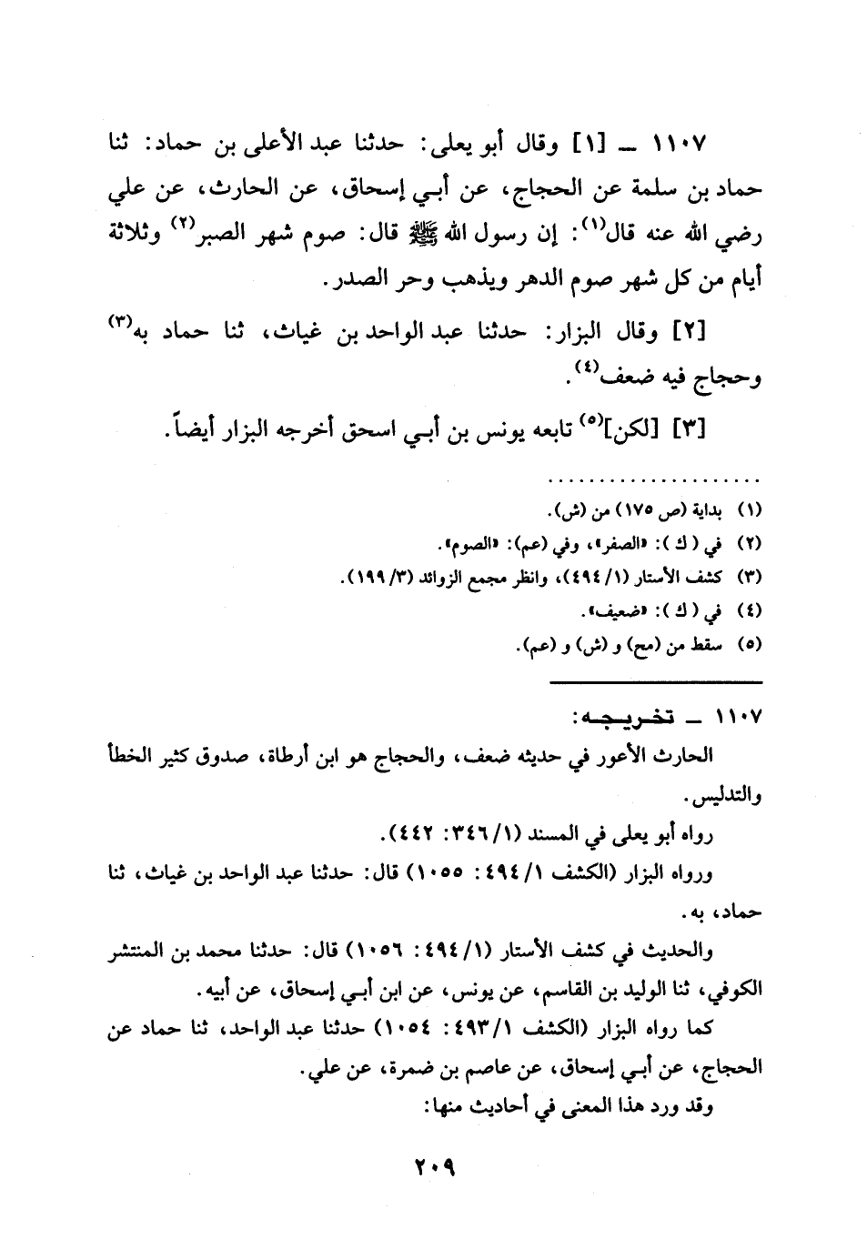 1107 -[1] وَقَالَ أَبُو يَعْلَى حَدَّثَنَا عَبْدُ الْأَعْلَى بْنُ حَمَّادٍ ثنا حَمَّادُ بْنُ سَلَمَةَ عَنِ الْحَجَّاجِ عَنْ أَبِي إِسْحَاقَ عَنِ الْحَارِثِ عن علي رَضِيَ الله عَنْه قال أَنَّ رَسُولَ اللَّهِ صَلَّى اللَّهُ عَلَيْهِ وَسَلَّمَ قَالَ §صَوْمُ شَهْرِ الصَّبْرِ وَثَلَاثَةِ أَيَّامٍ مِنْ كُلِّ شَهْرٍ صَوْمُ الدهر ويذهب وحر الصَّدْرِ