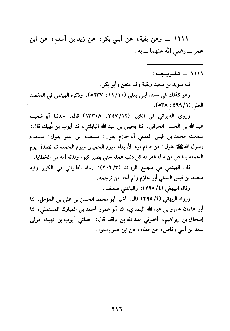 1111 - وَعَنْ بَقِيَّةَ، عَنْ أَبِي بَكْرٍ، عَنْ زَيْدِ بْنِ أَسْلَمَ، عَنِ ابْنِ عُمَرَ -رَضِيَ اللَّهُ عنهما- به.