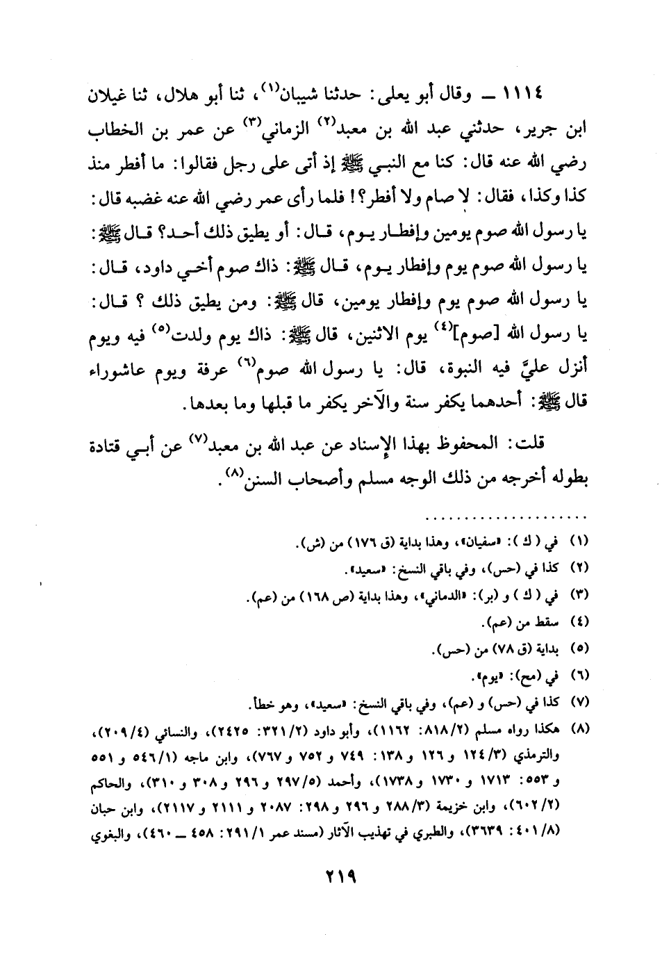 1114 - وَقَالَ أَبُو يعلى حدثنا شيبان ثنا أَبُو هِلَالٍ ثنا غَيْلَانُ ابن جَرِيرٍ حَدَّثَنِي عَبْدُ اللَّهِ بْنُ مَعْبَدٍ الزِّمَّانِيُّ عَنْ عُمَرَ بن الخطاب رَضِيَ الله عَنْه قَالَ كُنَّا مَعَ النَّبِيِّ صَلَّى اللَّهُ عَلَيْهِ وَسَلَّمَ إِذْ أَتَى عَلَى رَجُلٍ فَقَالُوا مَا أَفْطَرَ مُنْذُ كَذَا وَكَذَا فَقَالَ §لَا صَامَ وَلَا أَفْطَرَ فَلَمَّا رأى عمر رَضِيَ الله عَنْه غَضَبَهُ قَالَ يَا رَسُولَ اللَّهِ صَوْمُ يَوْمَيْنِ وَإِفْطَارُ يَوْمٍ قَالَ أَوَ يُطِيقُ ذَلِكَ أَحَدٌ قَالَ صَلَّى اللَّهُ عَلَيْهِ وَسَلَّمَ يَا رسول الله سوم يَوْمٍ وَإِفْطَارُ يوم قال صَلَّى اللَّهُ عَلَيْهِ وَسَلَّمَ ومن يطيق ذلك قَالَ يَا رَسُولَ اللَّهِ صَوْمُ يَوْمٍ وَإِفْطَارُ يَوْمَيْنِ قَالَ صَلَّى اللَّهُ عَلَيْهِ وَسَلَّمَ وَمَنْ يُطِيقُ ذَلِكَ قَالَ يَا رَسُولَ اللَّهِ صَوْمُ يَوْمِ الِاثْنَيْنِ قَالَ صَلَّى اللَّهُ عَلَيْهِ وَسَلَّمَ ذَاكَ يَوْمٌ وُلِدْتُ فِيهِ وَيَوْمٌ أُنْزِلَ عَلَيَّ فِيهِ النُّبُوَّةُ قَالَ يَا رَسُولَ اللَّهِ صَوْمُ عَرَفَةَ وَيَوْمِ عَاشُورَاءَ قَالَ صَلَّى اللَّهُ عَلَيْهِ وَسَلَّمَ أَحَدُهُمَا يُكَفِّرُ سَنَةً وَالْآخَرُ يُكَفِّرُ مَا قَبْلَهَا وَمَا بَعْدَهَا قُلْتُ الْمَحْفُوظُ بِهَذَا اسناد عَنْ عَبْدِ اللَّهِ بْنِ مَعْبَدٍ عَنْ أَبِي قتادة بطوله أخرجه مِنْ ذَلِكَ الْوَجْهِ مُسْلِمٌ وَأَصْحَابُ السُّنَنِ