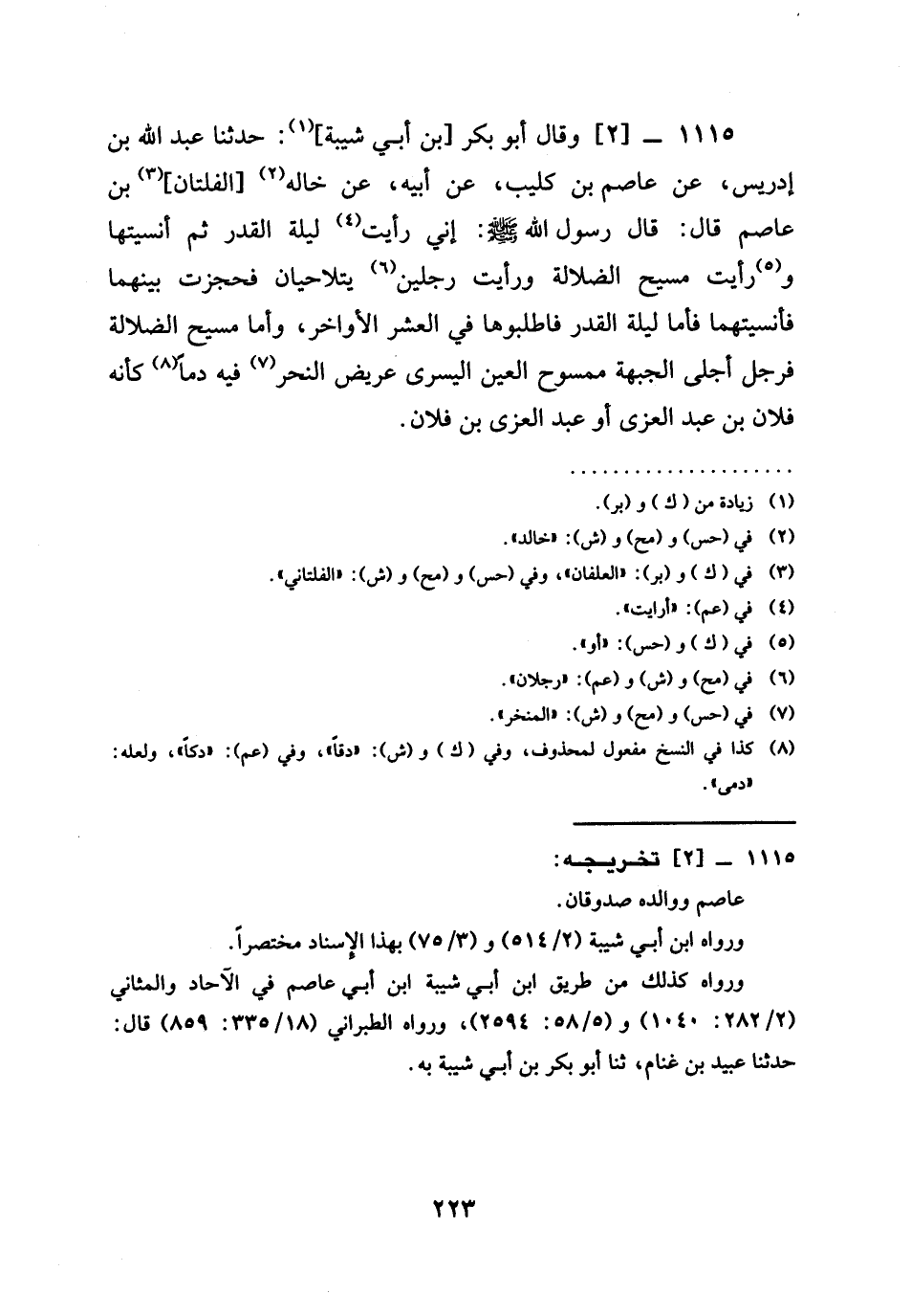 1115 -[2] وقَالَ أَبُو بَكْرِ بْنُ أَبِي شَيْبَةَ حَدَّثَنَا عَبْدُ اللَّهِ بْنُ إِدْرِيسَ عَنْ عَاصِمِ بْنِ كُلَيْبٍ عَنْ أَبِيهِ عَنْ خَالِهِ الْفَلْتَانِ بْنِ عَاصِمٍ قَالَ قَالَ رَسُولُ اللَّهِ صَلَّى اللَّهُ عَلَيْهِ وَسَلَّمَ إِنِّي §رَأَيْتُ لَيْلَةَ الْقَدْرِ ثُمَّ أُنْسِيتُهَا وَرَأَيْتُ مَسِيحَ الضَّلَالَةِ وَرَأَيْتُ رجلين يتلاحان فَحَجَزْتُ بَيْنَهُمَا فَأُنْسِيتُهُمَا فَأَمَّا لَيْلَةُ الْقَدْرِ فَاطْلُبُوهَا فِي الْعَشْرِ الْأَوَاخِرِ وَأَمَّا مَسِيحُ الضَّلَالَةِ فَرَجُلٌ أَجْلَى الْجَبْهَةِ مَمْسُوحُ الْعَيْنِ الْيُسْرَى عَرِيضُ النحر فيه دما كَأَنَّهُ فُلَانُ بْنُ عَبْدِ الْعُزَّى أَوْ عَبْدِ الْعُزَّى بْنِ فُلَانٍ