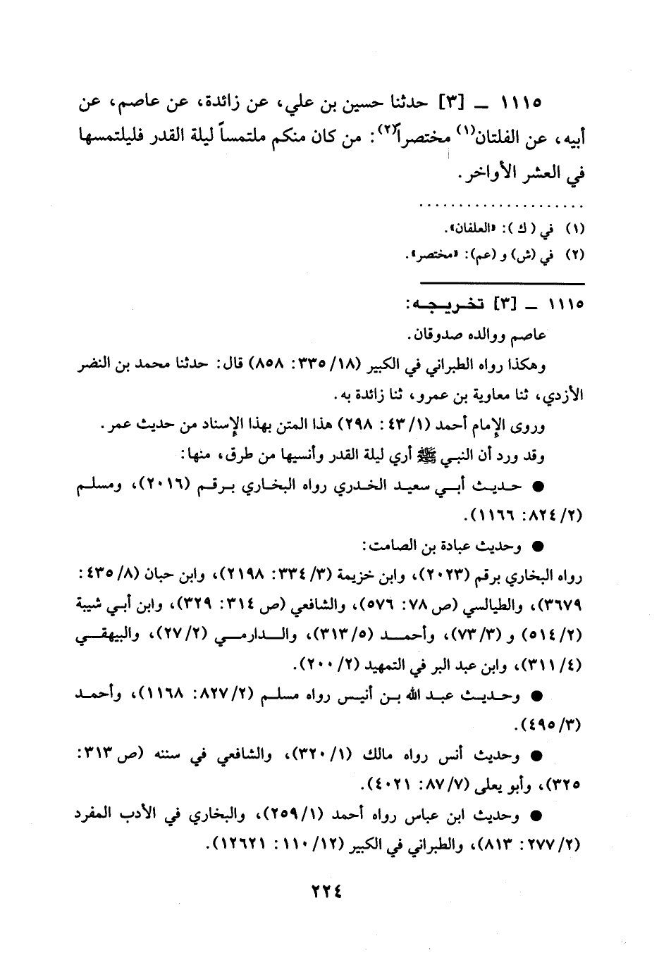 1115 -[3] حدثنا حُسَيْنُ بْنُ عَلِيٍّ عَنْ زَائِدَةَ عَنْ عَاصِمٍ عَنْ أَبِيهِ عَنِ الْفَلْتَانِ مُخْتَصَرًا §مَنْ كَانَ مِنْكُمْ مُلْتَمِسًا لَيْلَةَ الْقَدْرِ فَلْيَلْتَمِسْهَا فِي الْعَشْرِ الْأَوَاخِرِ