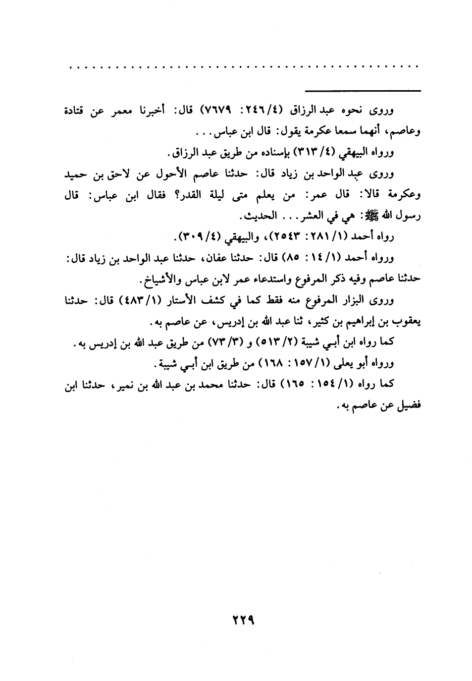 وروى عبد الواحد بن زياد قال: حدثنا عاصم الأحول عن لاحق بن حميد وعكرمة قالا: قال عمر: من يعلم متى ليلة القدر؟ فقال ابْنِ عَبَّاسٍ: قَالَ رَسُولُ اللَّهِ -صَلَّى اللَّهُ عليه وسلم-: هي في العشر ... الحديث.
