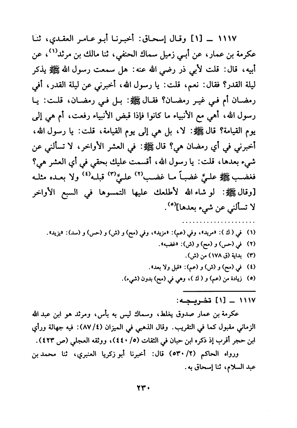 1117 -[1]- وَقَالَ إِسْحَاقُ أَخْبَرَنَا أَبُو عَامِرٍ الْعَقَدِيُّ ثنا عِكْرِمَةُ بْنُ عَمَّارٍ عَنْ أَبِي زُمَيْلٍ سِمَاكٍ الْحَنَفِيِّ ثنا مَالِكُ بْنُ مَرْثَدٍ عَنْ أَبِيهِ قَالَ قُلْتُ لأبي ذر رَضِيَ الله عَنْه هَلْ سَمِعْتَ رَسُولَ اللَّهِ صَلَّى اللَّهُ عَلَيْهِ وَسَلَّمَ يَذْكُرُ لَيْلَةَ الْقَدْرِ فَقَالَ نَعَمْ قُلْتُ يَا رَسُولَ اللَّهِ أَخْبِرْنِي عَنْ ليلة القدر أفي رَمَضَانَ أْمَ فِي غَيْرِ رَمَضَانَ فَقَالَ صَلَّى اللَّهُ عَلَيْهِ وَسَلَّمَ بَلْ فِي رَمَضَانَ قُلْتُ يَا رَسُولَ اللَّهِ أَهِيَ مَعَ الْأَنْبِيَاءِ مَا كَانُوا فَإِذَا قُبِضَ الْأَنْبِيَاءُ رُفِعَتْ أَمْ هِيَ إِلَى يَوْمِ الْقِيَامَةِ قال صَلَّى اللَّهُ عَلَيْهِ وَسَلَّمَ لا بل هي إلى يوم القيامة قُلْتُ يَا رسول الله أخبرني فِي أَيِّ رَمَضَانَ هي قال صَلَّى اللَّهُ عَلَيْهِ وَسَلَّمَ في الْعَشْرِ الْأَوَاخِرِ لَا تَسْأَلْنِي عن شيء بعدها قُلْتُ يَا رَسُولَ اللَّهِ أَقْسَمْتُ عَلَيْكَ بِحَقِّي فِي أَيِّ الْعَشْرِ هِيَ فَغَضِبَ صَلَّى اللَّهُ عَلَيْهِ وَسَلَّمَ عَلَيَّ غَضَبًا مَا غَضِبَ عَلَيَّ قَبْلَهُ وَلَا بَعْدَهُ مِثْلَهُ وَقَالَ صَلَّى اللَّهُ عَلَيْهِ وَسَلَّمَ لَوْ شَاءَ اللَّهُ أطلعك عَلَيْهَا §الْتَمِسُوهَا السَّبْعِ الْأَوَاخِرِ لا تَسْأَلْنِي عَنْ شَيْءٍ بَعْدَهَا -[231]-