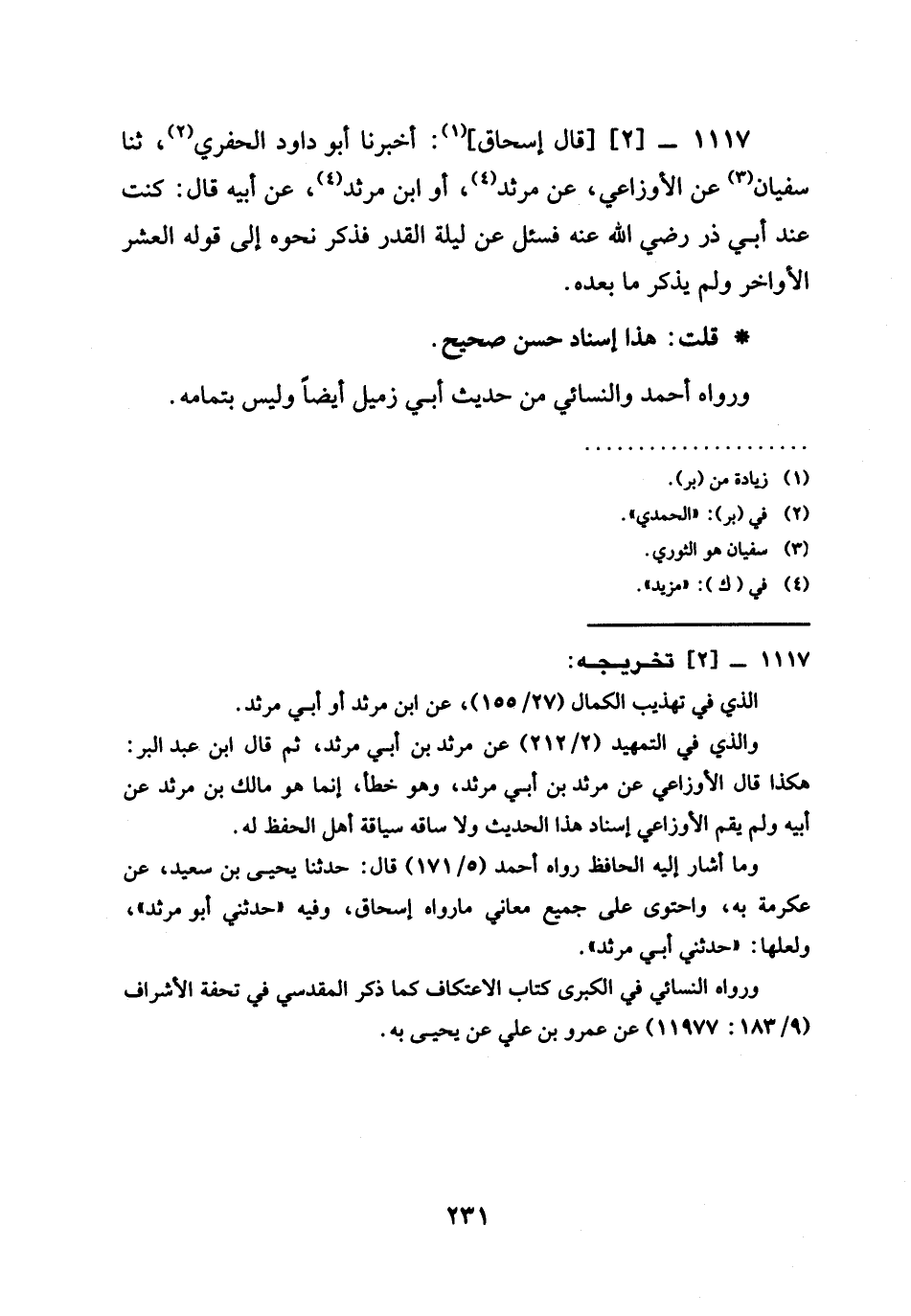 1117 - [2] [قال إِسْحَاقُ] (¬1): أَخْبَرَنَا أَبُو دَاوُدَ الْحَفَرِيُّ (¬2)، ثنا سُفْيَانُ (¬3) عن الأوزاعي، عن مرثد (¬4)، أو ابن مَرْثَدٍ (4)، عَنْ أَبِيهِ قَالَ: كُنْتُ عِنْدَ أَبِي ذر رضي الله عنه فَسُئِلَ عَنْ لَيْلَةِ الْقَدْرِ فَذَكَرَ نَحْوَهُ إِلَى قَوْلِهِ الْعَشْرِ الْأَوَاخِرِ وَلَمْ يَذْكُرْ مَا بَعْدَهُ.