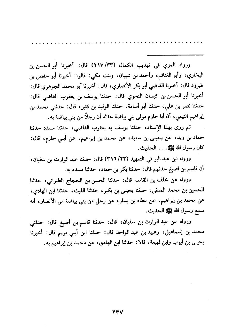 ثم روى بهذا الإسناد، حدثنا يوسف به يعقوب القاضي، حدثنا مسدد حَدَّثَنَا حَمَّادُ بْنُ زَيْدٍ، عَنْ يَحْيَى بْنِ سَعِيدٍ، عَنْ محمَّد بْنِ إِبْرَاهِيمَ، عَنْ أَبِي حازم، قَالَ: كَانَ رَسُولُ اللَّهِ -صَلَّى اللَّهُ عَلَيْهِ وسلم- ... الحديث.