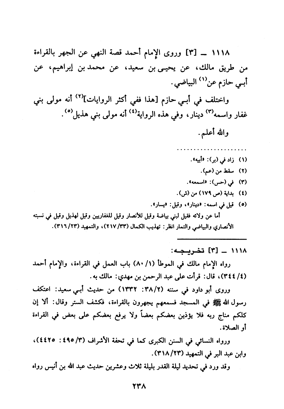 1118 - [3] وَرَوَى الإِمام أَحْمَدُ قِصَّةَ النَّهْيِ عَنِ الْجَهْرِ بِالْقِرَاءَةِ مِنْ طَرِيقِ مَالِكٍ، عَنْ يَحْيَى بْنِ سَعِيدٍ، عَنْ مُحَمَّدِ بْنِ إِبْرَاهِيمَ، عَنْ أَبِي حَازِمٍ عَنِ (¬1) الْبَيَاضِيِّ.