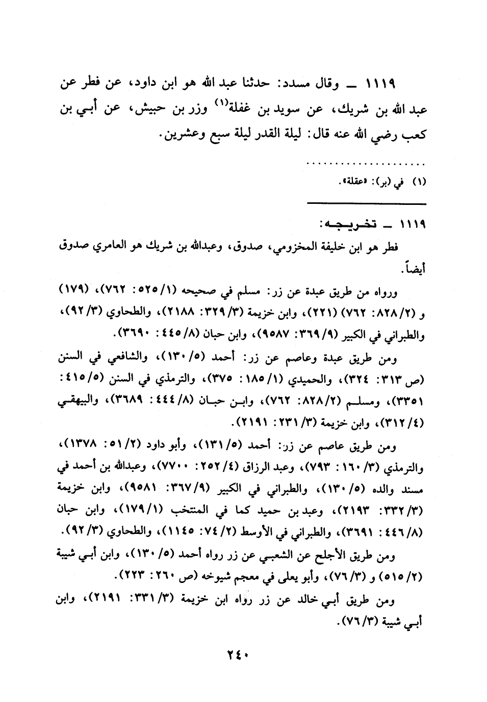 1119 - وَقَالَ مُسَدَّدٌ حَدَّثَنَا عَبْدُ اللَّهِ هُوَ ابْنُ دَاوُدَ عَنْ فِطْرٍ عَنْ عَبْدِ اللَّهِ بْنِ شَرِيكٍ عَنْ سُوَيْدِ بْنِ غَفَلَةَ وَزِرِّ بْنِ حُبَيْشٍ عَنْ أُبَيِّ بن كعب رَضِيَ الله عَنْه قَالَ §لَيْلَةُ الْقَدْرِ لَيْلَةُ سَبْعٍ وَعِشْرِينَ