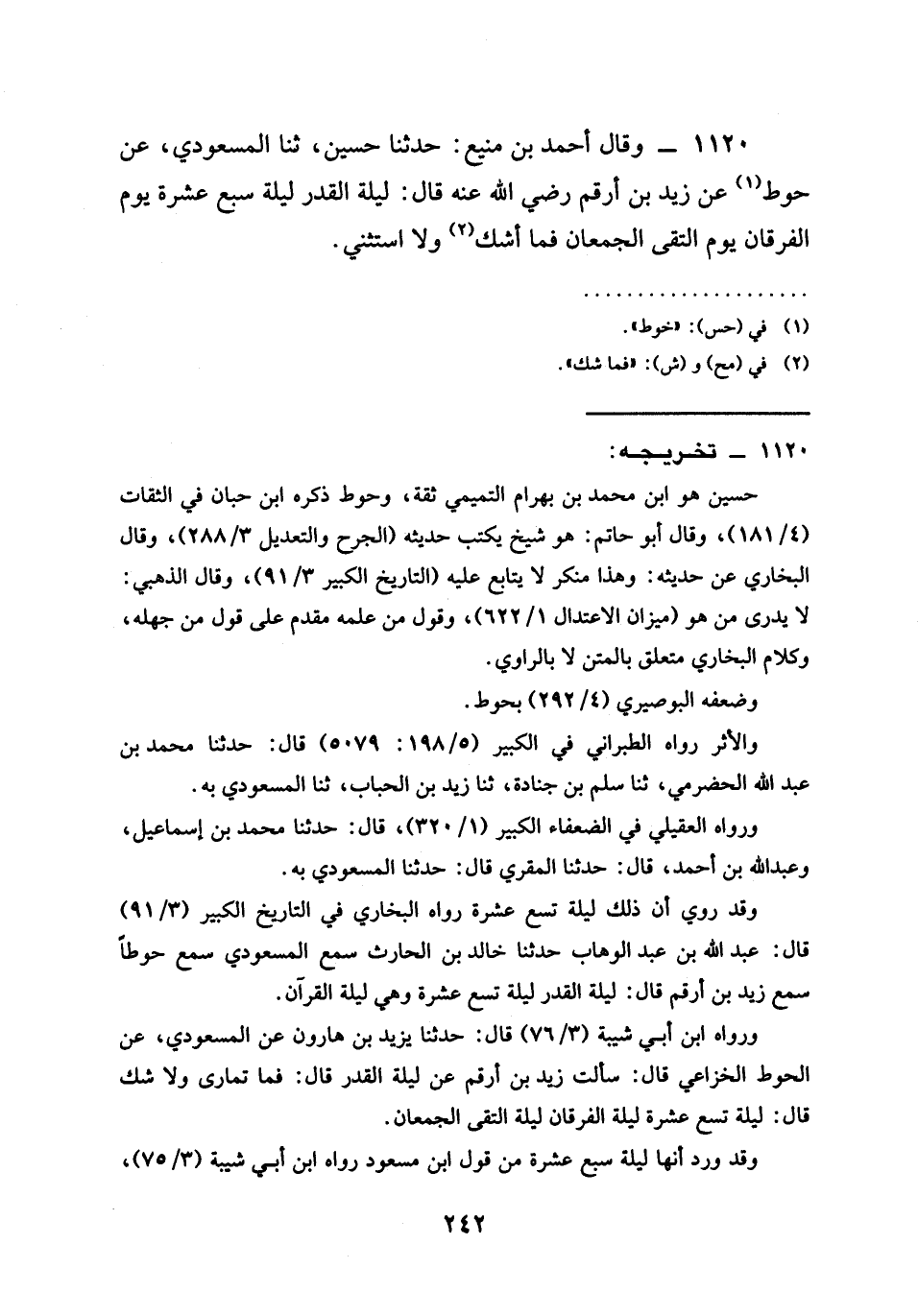31120 - وَقَالَ أَحْمَدُ بْنُ مَنِيعٍ حَدَّثَنَا حُسَيْنٌ ثنا المسعودي عن حوط عَنْ زَيْدِ بن أرقم رَضِيَ الله عَنْه قَالَ §لَيْلَةُ الْقَدْرِ لَيْلَةُ سَبْعَ عَشْرَةَ يَوْمَ الْفُرْقَانِ يَوْمَ الْتَقَى الْجَمْعَانِ فَمَا أَشُكُّ وَلَا أَسْتَثْنِي