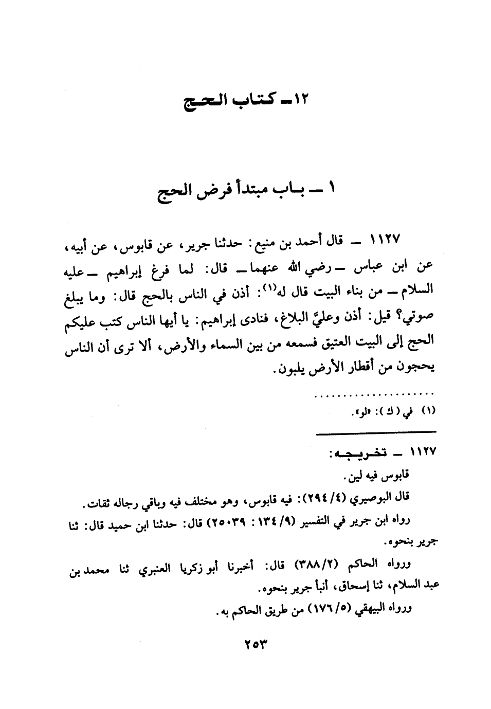 1127 - قَالَ أَحْمَدُ بْنُ مَنِيعٍ حَدَّثَنَا جرير عن ابوس عَنْ أَبِيهِ عَنِ ابن عباس رَضِيَ الله عَنْهما قَالَ لَمَّا فَرَغَ إِبْرَاهِيمُ عَلَيْهِ السَّلَامُ مِنْ بِنَاءِ الْبَيْتِ قَالَ لَهُ أَذِّنْ فِي النَّاسِ بِالْحَجِّ قَالَ وَمَا يَبْلُغُ صَوْتِي قِيلَ أَذِّنْ وَعَلَيَّ الْبَلَاغُ فَنَادَى إِبْرَاهِيمُ يَا أَيُّهَا النَّاسُ §كُتِبَ عَلَيْكُمُ الْحَجُّ إِلَى الْبَيْتِ الْعَتِيقِ فسمعه من بَيْنَ السماء والأرض أى تَرَى أَنَّ النَّاسَ يَحُجُّونَ مِنْ أَقْطَارِ الْأَرْضِ يُلَبُّونَ