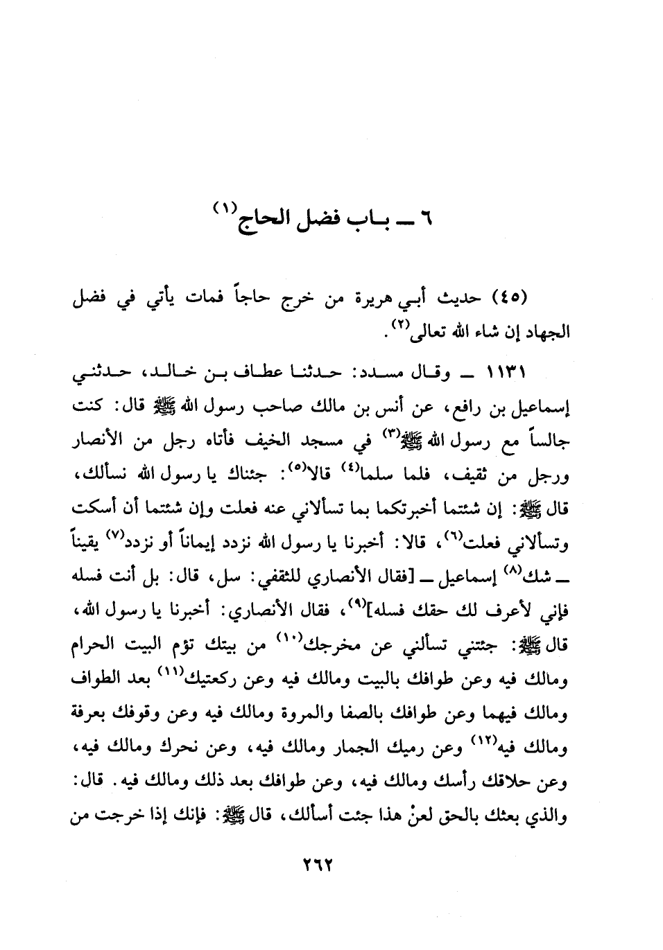 1131 - وقال مُسَدَّدٌ حَدَّثَنَا عَطَّافُ بْنُ خَالِدٍ حَدَّثَنِي إِسْمَاعِيلُ بْنُ رَافِعٍ عَنْ أَنَسِ بْنِ مَالِكٍ صَاحِبِ رَسُولِ اللَّهِ صَلَّى اللَّهُ عَلَيْهِ وَسَلَّمَ قَالَ كُنْتُ جَالِسًا مَعَ رَسُولِ اللَّهِ صَلَّى اللَّهُ عَلَيْهِ وَسَلَّمَ فِي مَسْجِدِ الْخَيْفِ فَأَتَاهُ رَجُلٌ مِنَ الأنصار وَرَجُلٌ مِنْ ثقيف فلما سلما قَالَا جِئْنَاكَ يَا رَسُولَ اللَّهِ نَسْأَلُكَ قَالَ صَلَّى اللَّهُ عَلَيْهِ وَسَلَّمَ إِنْ شِئْتُمَا أَخْبَرْتُكُمَا بِمَا تَسْأَلَانِي عَنْهُ فَعَلْتُ وَإِنْ شِئْتُمَا أَنْ أَسْكُتَ وَتَسْأَلَانِي فَعَلْتُ قَالَا أَخْبِرْنَا يَا رَسُولَ اللَّهِ نَزْدَدْ إيمانا أو نزدد يَقِينًا شَكَّ إِسْمَاعِيلُ فَقَالَ الْأَنْصَارِيُّ لِلثَّقَفِيِّ سَلْ قَالَ بَلْ أَنْتَ فَسَلْهُ فَإِنِّي لَأَعْرِفُ لَكَ حَقَّكَ فَسَلْهُ فَقَالَ الْأَنْصَارِيُّ أَخْبِرْنَا يَا رَسُولَ اللَّهِ قَالَ صَلَّى اللَّهُ عَلَيْهِ وَسَلَّمَ جِئْتَنِي تَسْأَلُنِي عَنْ مَخْرَجِكَ مِنْ بَيْتِكَ تَؤُمُّ الْبَيْتَ الْحَرَامَ وَمَالَكَ فِيهِ وَعَنْ طَوَافِكَ بِالْبَيْتِ وَمَالَكَ فِيهِ وَعَنْ رَكْعَتَيْكَ بعد الطواف ومالك فيهما وَعَنْ طَوَافِكَ بالصفا والمروة ومالك فيه وَعَنْ وقوفك بعرفة ومالك فِيهِ وَعَنْ رميك الجمار ومالك فِيهِ وعن نحرك ومالك فِيهِ وَعَنْ حلاقك رأسك ومالك فِيهِ وَعَنْ طَوَافِكَ بعد ذلك ومالك فِيهِ قَالَ وَالَّذِي بعثك بالحق لعن هَذَا جِئْتُ أَسْأَلُكَ قَالَ صَلَّى اللَّهُ عَلَيْهِ وَسَلَّمَ فَإِنَّكَ إِذَا خَرَجْتَ مِنْ